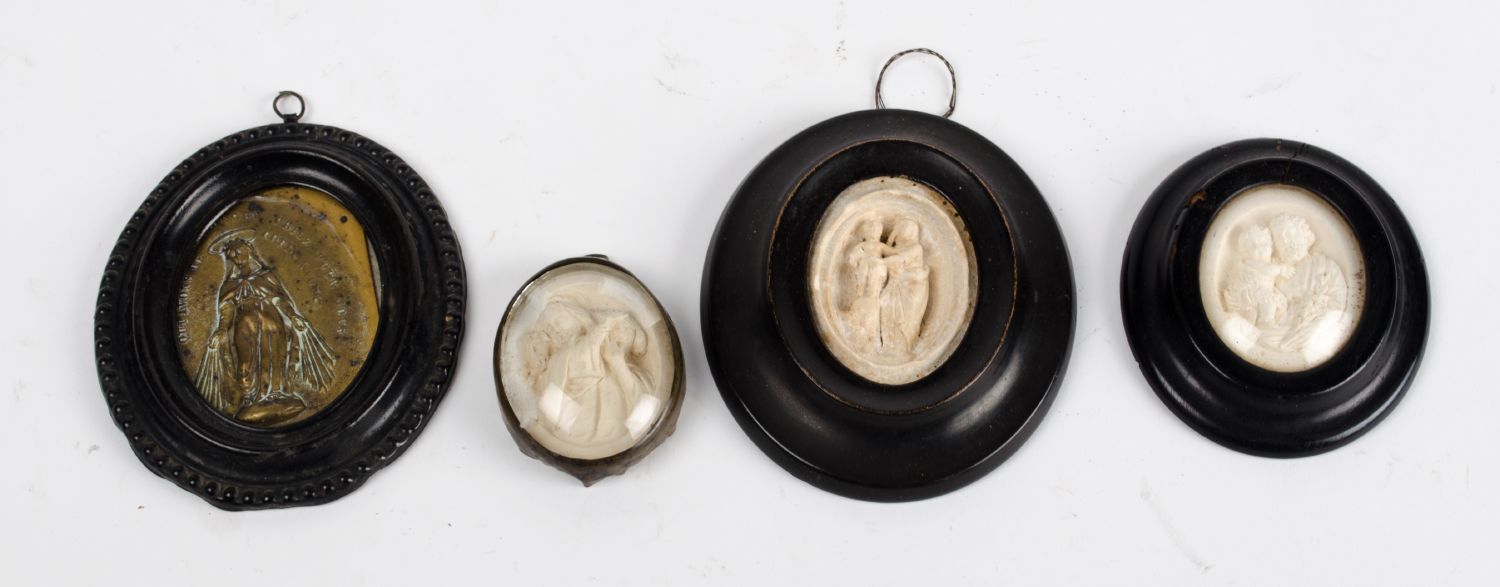 LOTTO composto da 3 BASSORILIEVI in schiuma di gesso e da BASSORILIEVO in metallo sbalzato raffiguranti "scene sacre". Italia XIX secolo Misure: varie