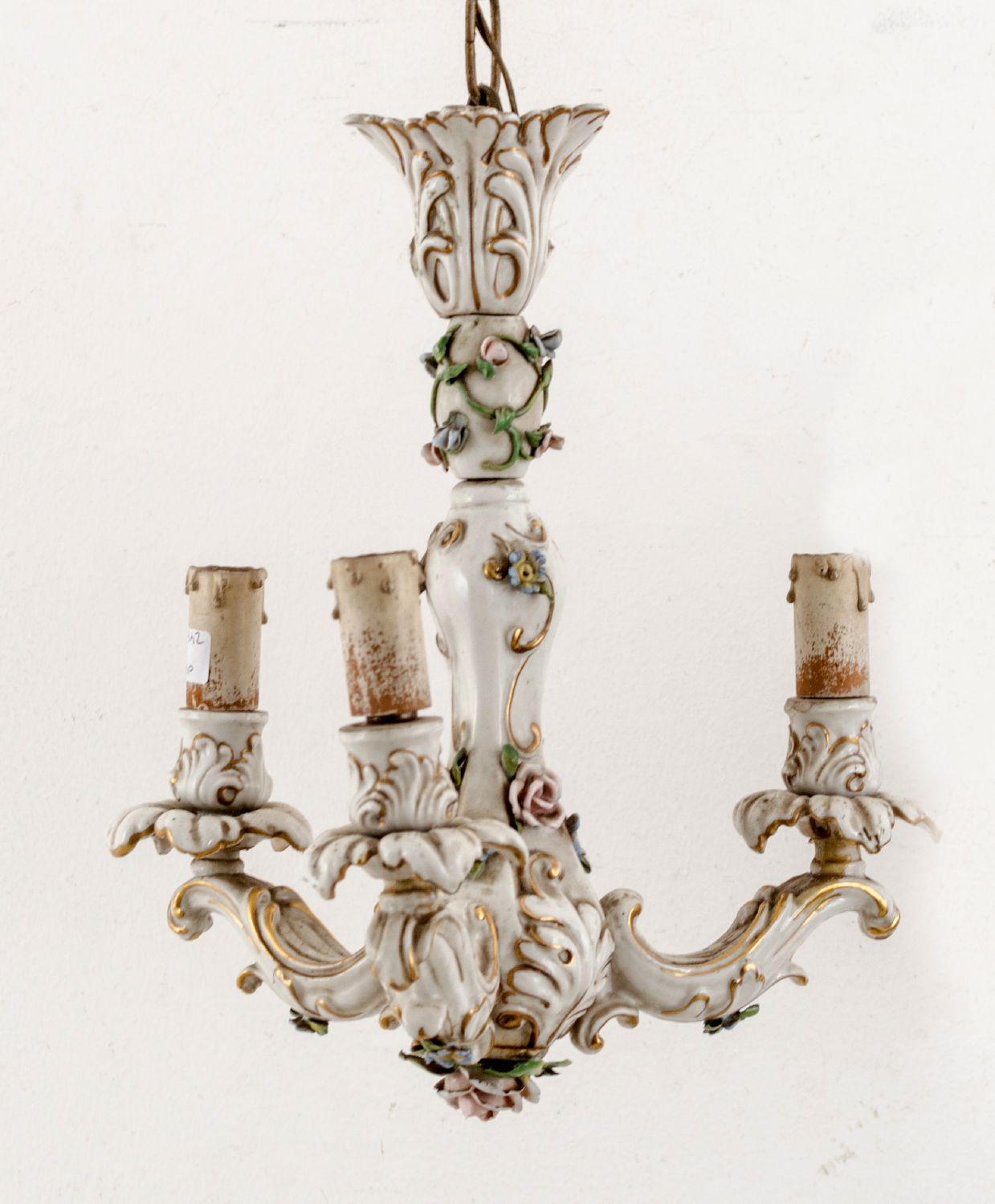 LAMPADARIO a tre luci in porcellana. Italia meta' '900 Misure: h cm 70