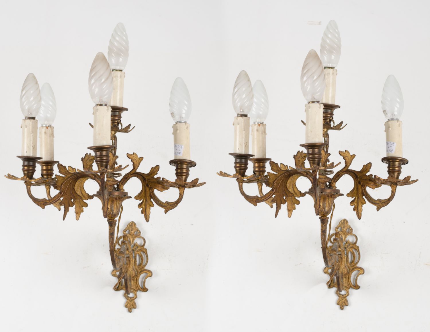COPPIA APPLIQUES stile Luigi XV a cinque luci in ottone dorato (elettrificato). Sicilia XIX secolo Misure: cm 35 x 50