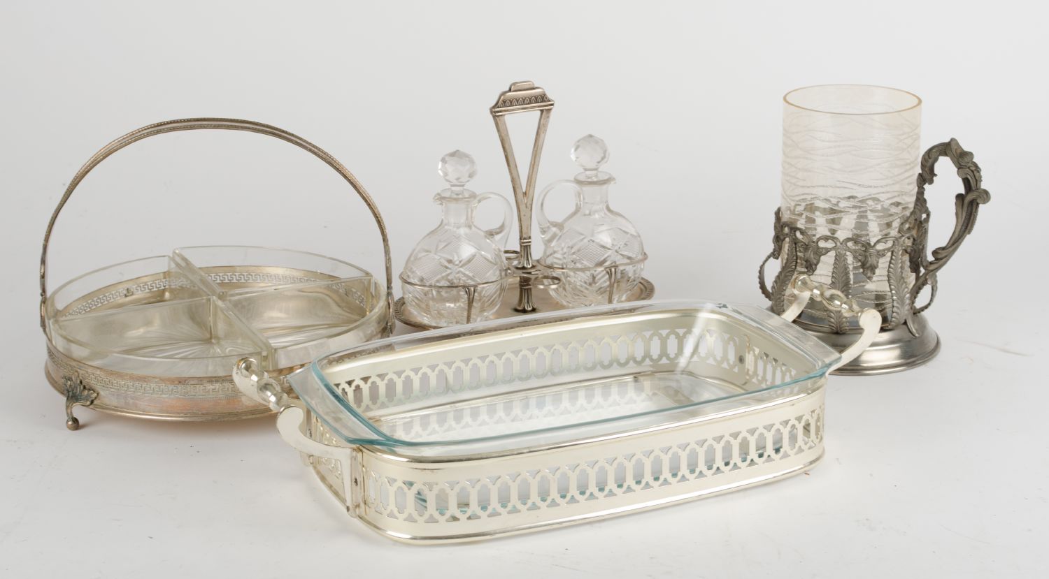 LOTTO composto da ANTIPASTIERA in metallo, MENAGE in argento, PIROFILA in silver plates e da PORTACANDELA in peltro. XX secolo Misure: varie