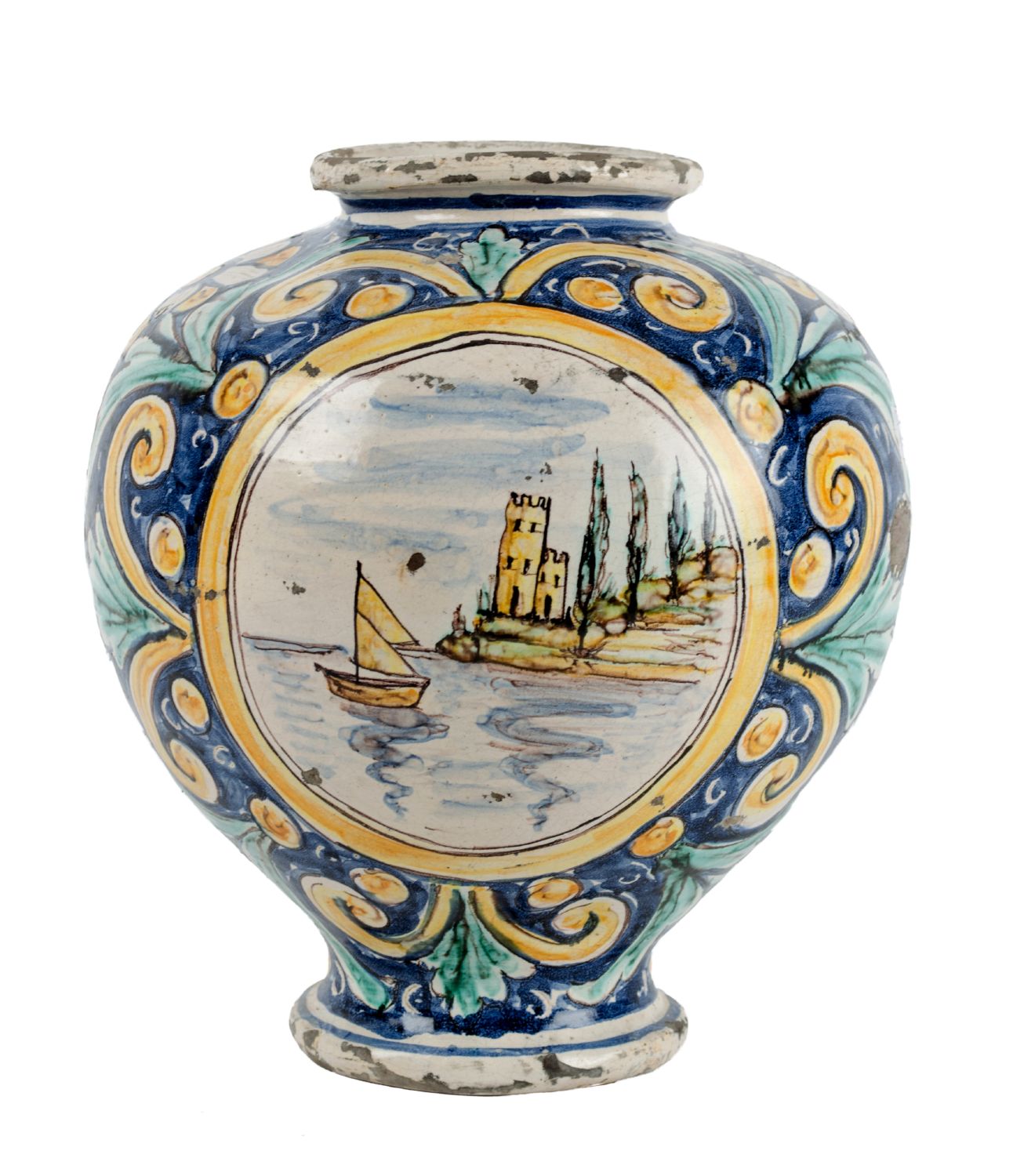 BOCCIA in ceramica smaltata e decorata con medaglione raffigurante "paesaggio marino". XX secolo Misure: h cm 30