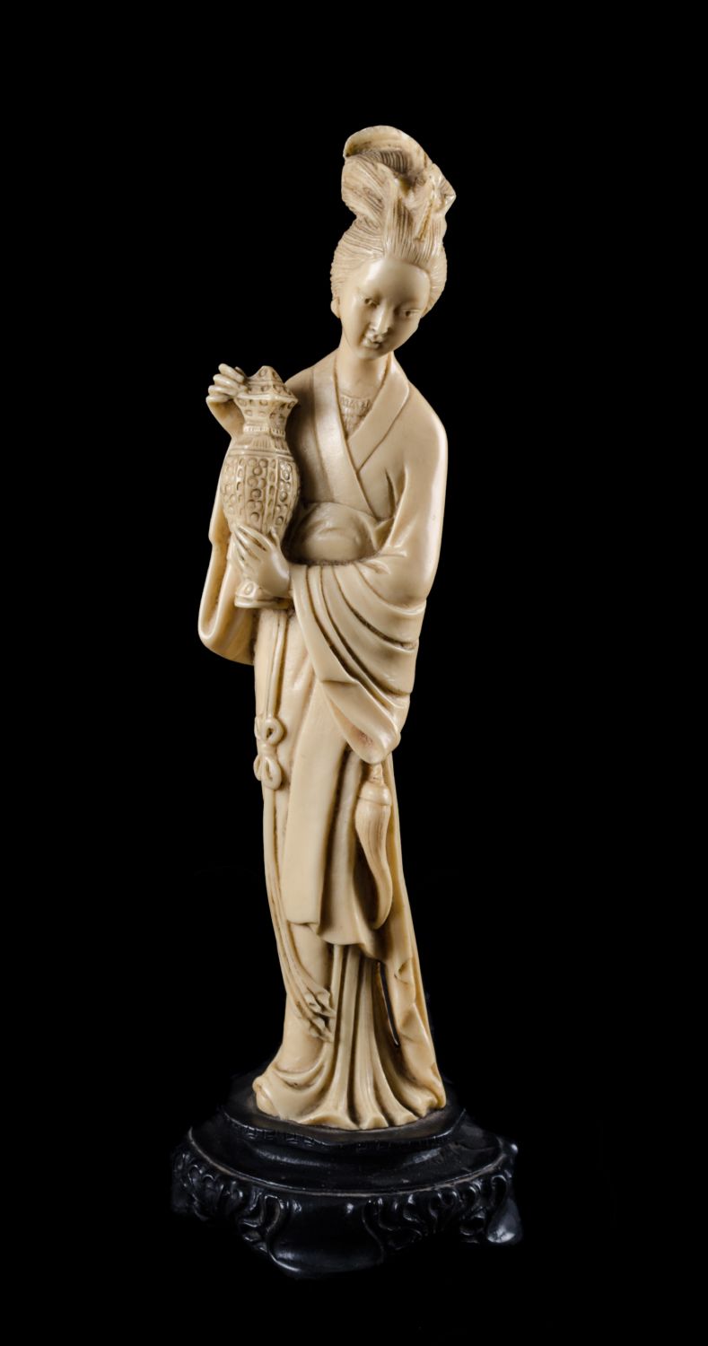 SCULTURA in pasta di avorio raffigurante "geisha", base in legno ebanizzato. XX secolo Misure: h cm 36