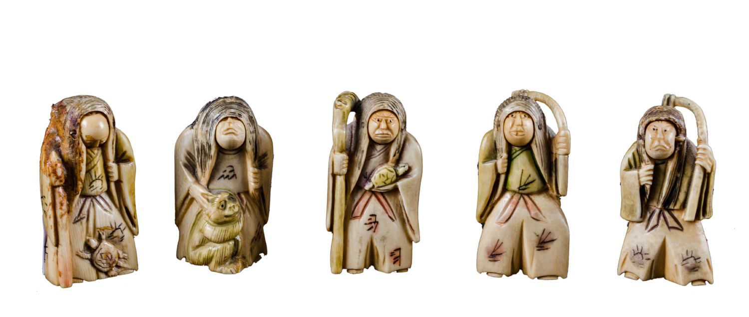 CINQUE NETZUKE' in avorio raffiguranti "saggi" con volti movibili. Cina XX secolo Misure: h cm 5
