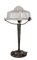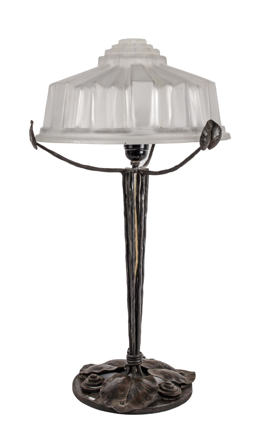 LAMPADA Liberty da tavola in bronzo brunito lavorato a motivo fogliaceo alla base, boccia in vetro lavorato. Primi '900 Misure: h cm 56