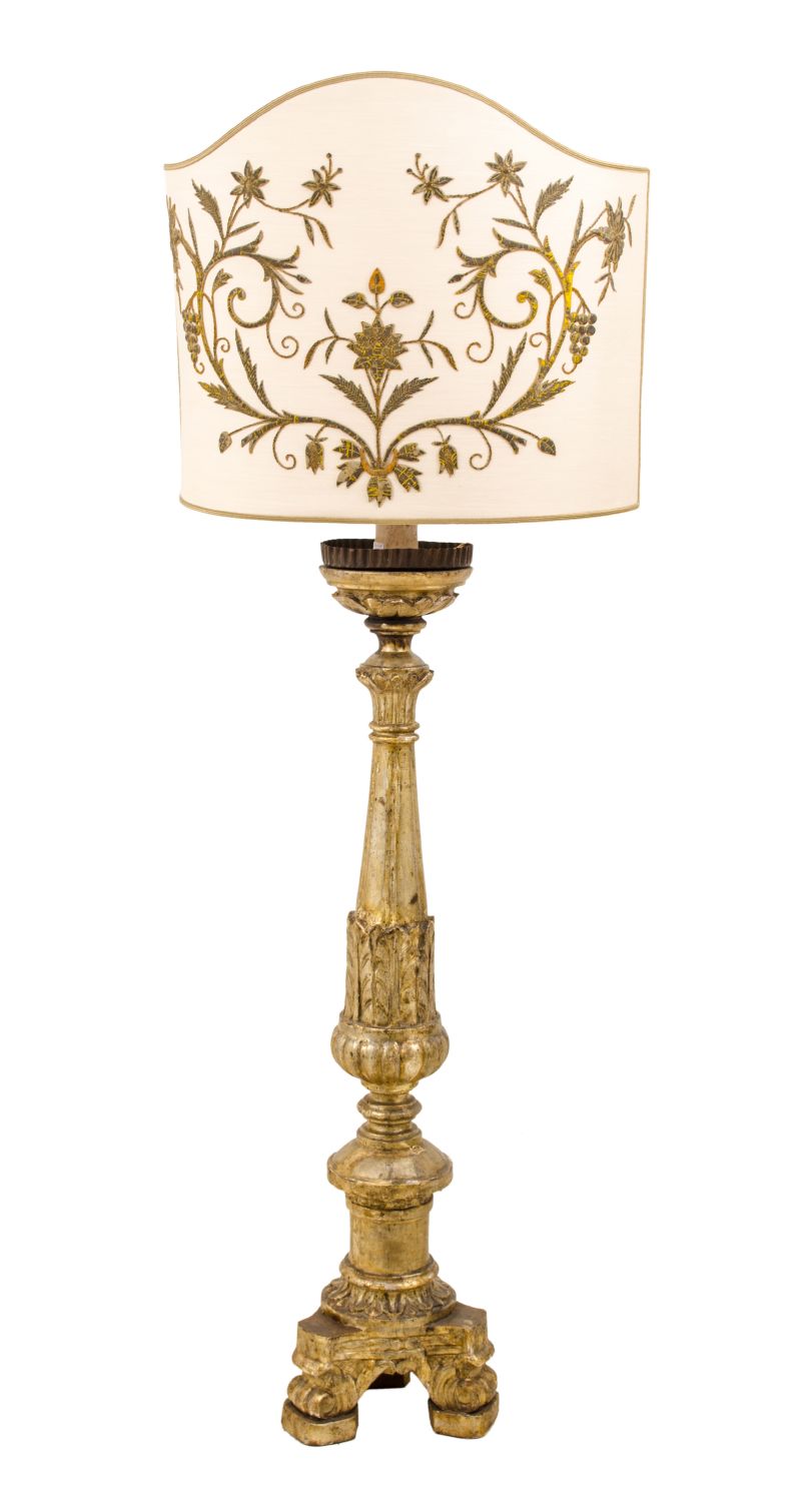 TORCIERE da terra in legno dorato ad argento e mistura con ventola in tessuto ricamato. Sicilia XIX secolo Misure: h cm 174