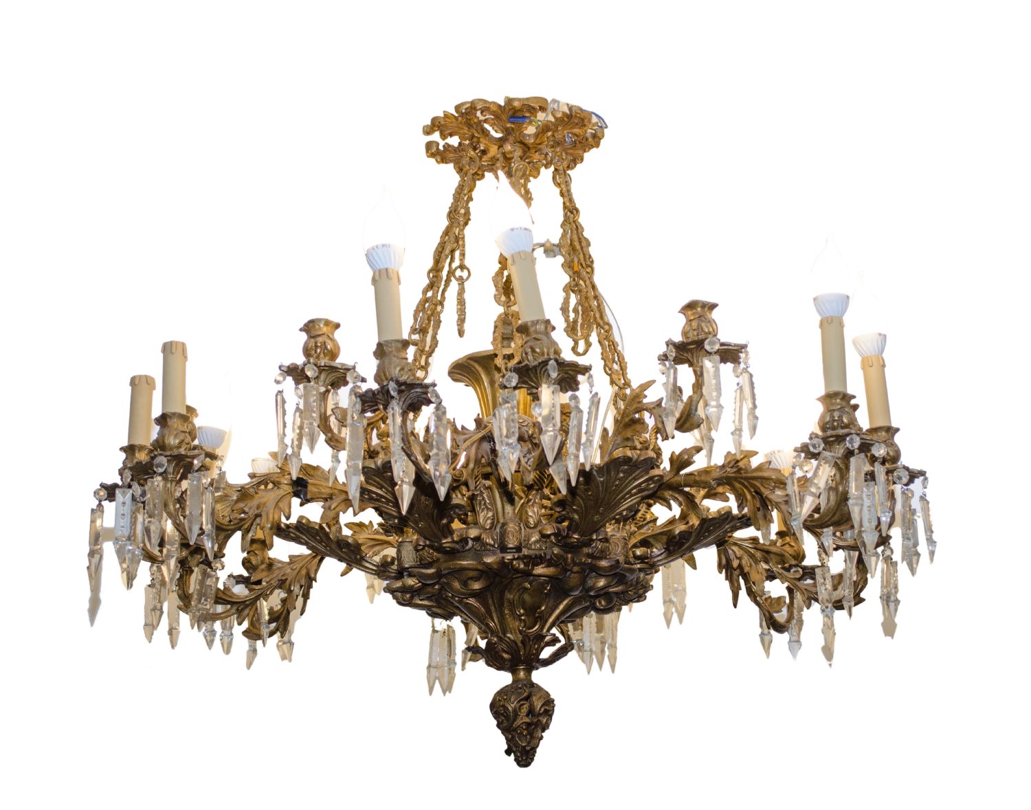 LAMPADARIO stile Luigi XV a 18 luci in bronzo con prismi in vetro. Italia primi '900 Misure: h cm 100