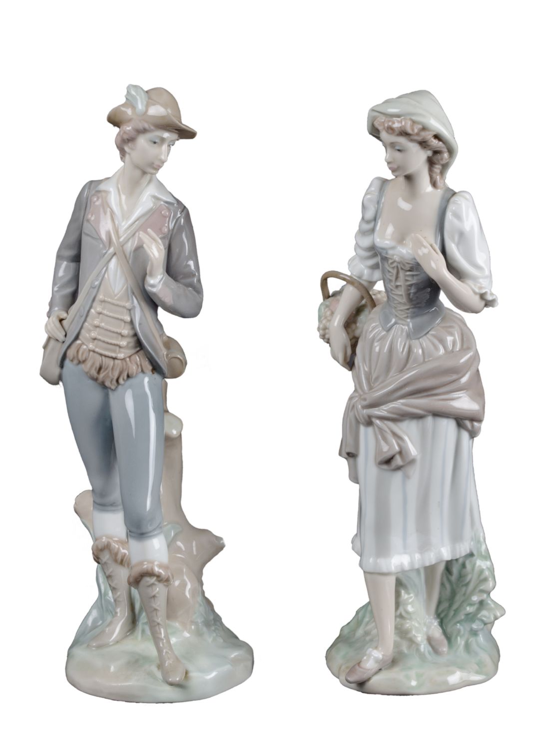 COPPIA SCULTURE in porcellana Lladro raffiguranti "fanciulla" e "ragazzo". Spagna XX secolo Misure: h cm 30