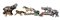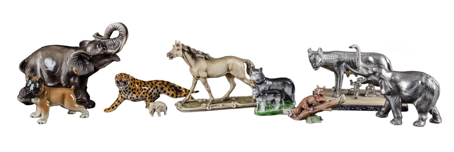LOTTO composto da SCULTURA in avorio "elefante", SCULTURA in terracotta "elefante", 2 SCULTURE in metallo "elefante" e "lupa con Romolo e Remo", 3 SCULTURE in biscuit "volpe", "cani" e "cavallo" e da 2 SCULTURINE in porcellana "cane" e "tigre". XX secolo Misure: varie