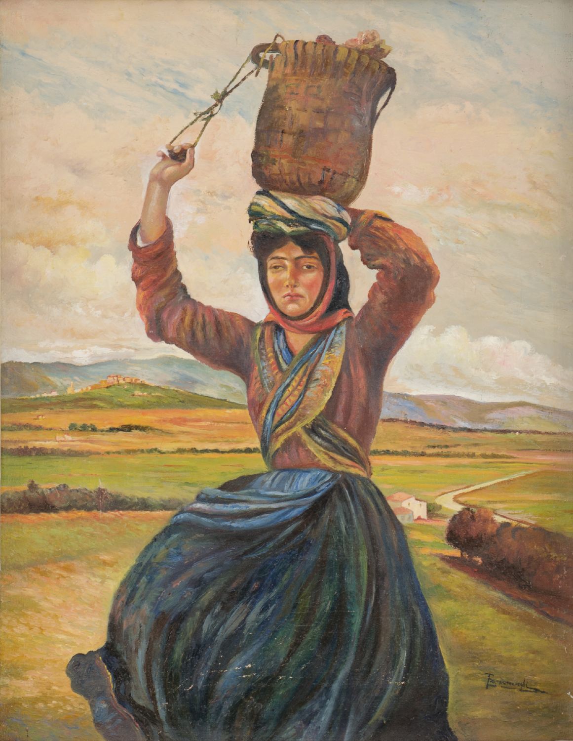 OLIO su tela "paesaggio con contadina", a firma Zandomeneghi Misure: cm 41,5 x 53