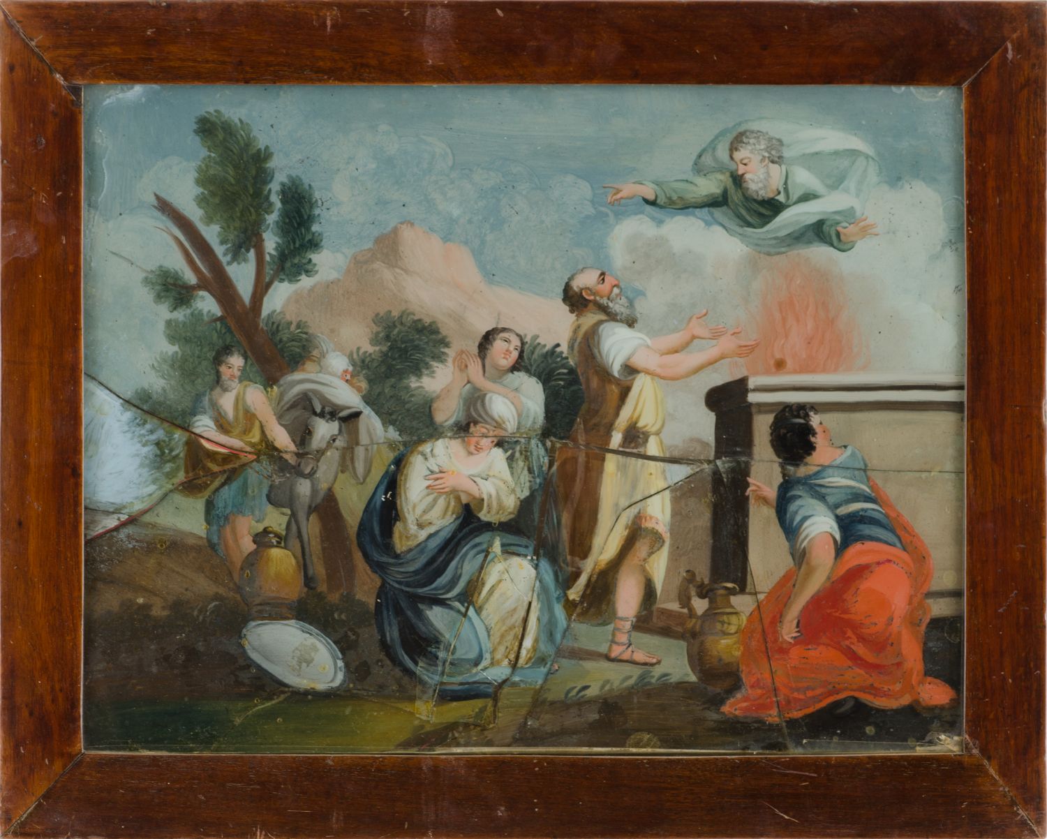 PITTURA su vetro "vittoria del Profeta Elia sui sacerdoti pagani di Baal" (restauri e rotture). Sicilia XVIII secolo Misure: cm 56 x 42,5