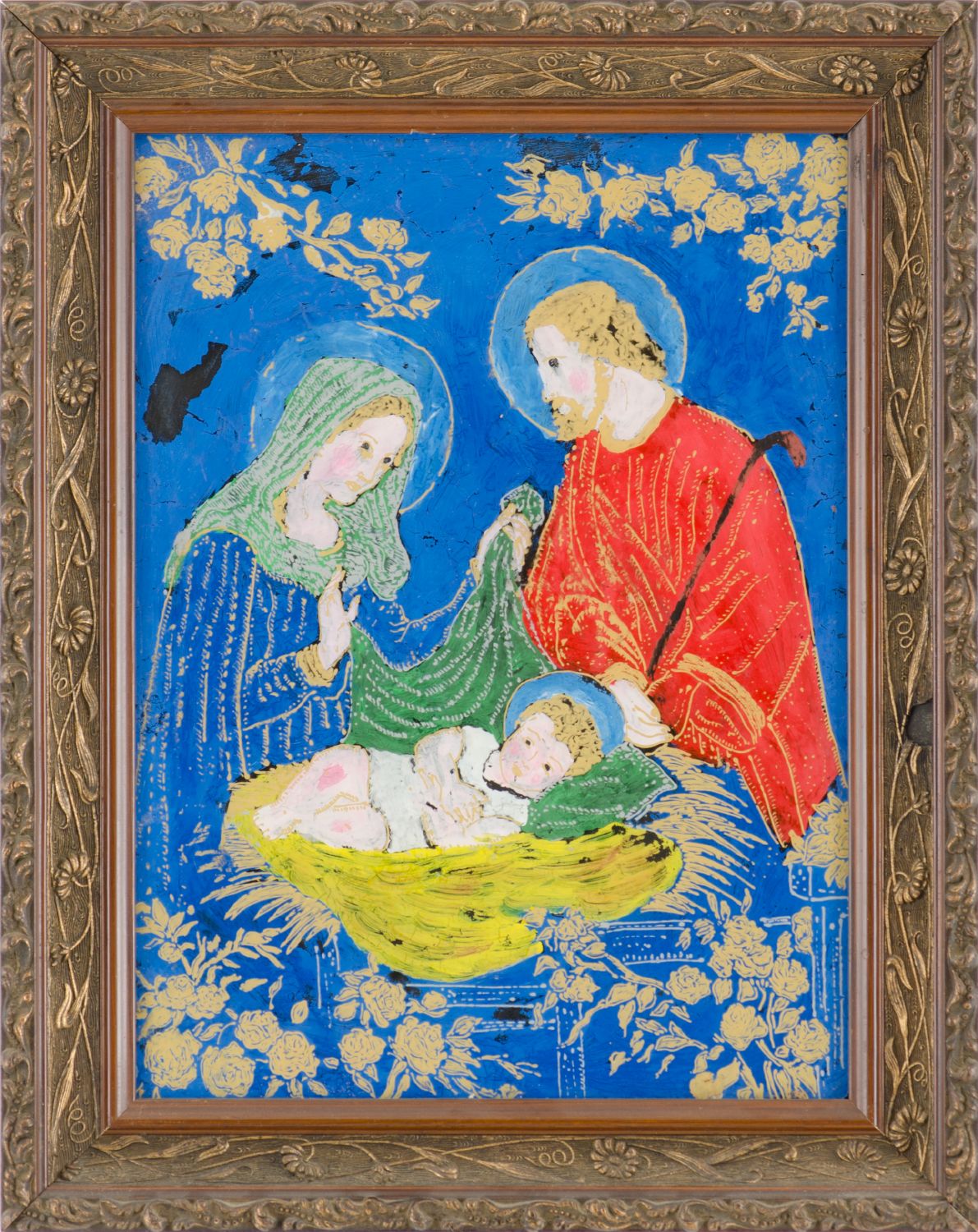 PITTURA su vetro "Sacra Famiglia". Sicilia XX secolo Misure: cm 30 x 40