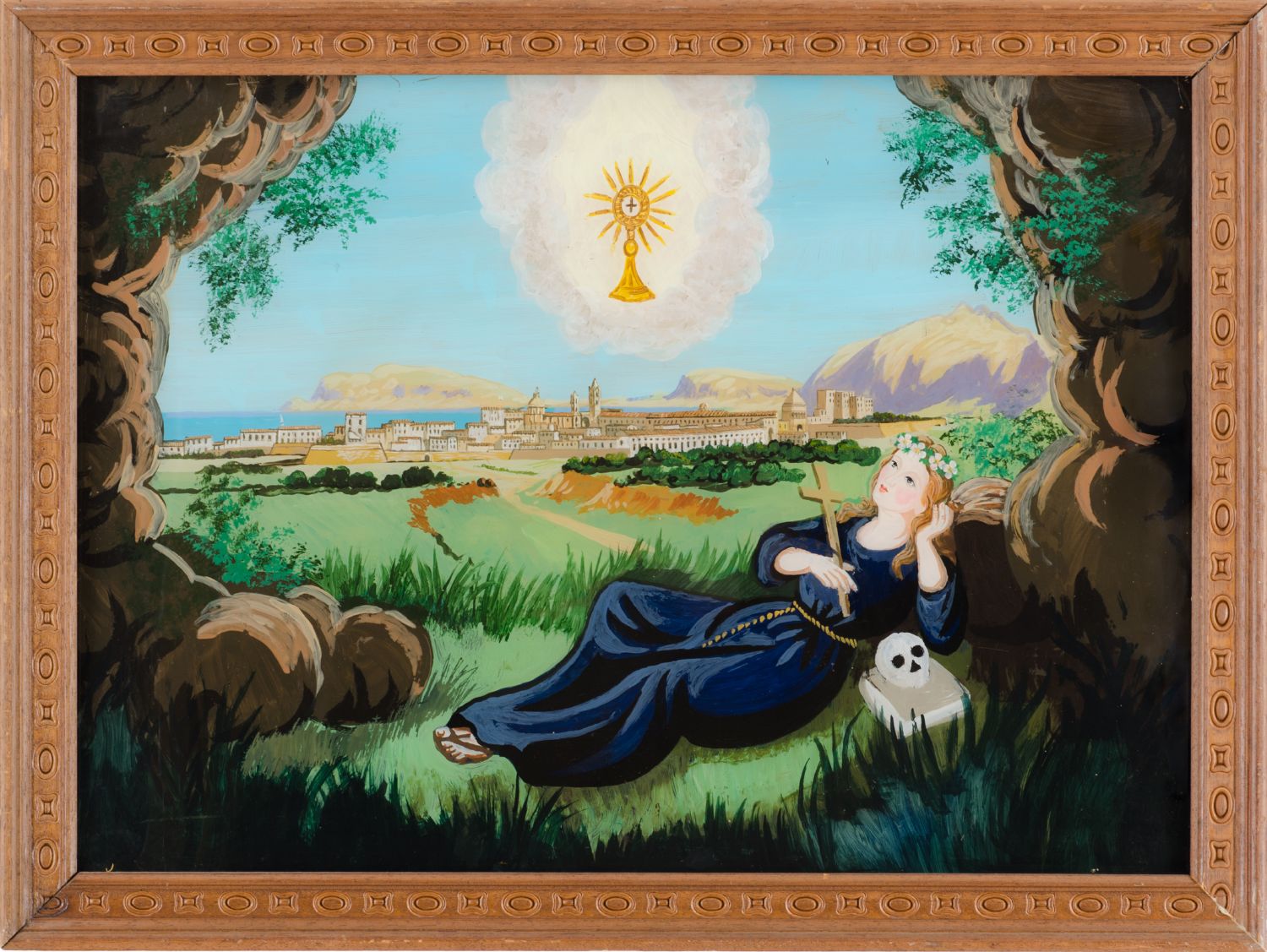 PITTURA su vetro "Santa Rosalia con veduta di Palermo". XX secolo Misure: cm...