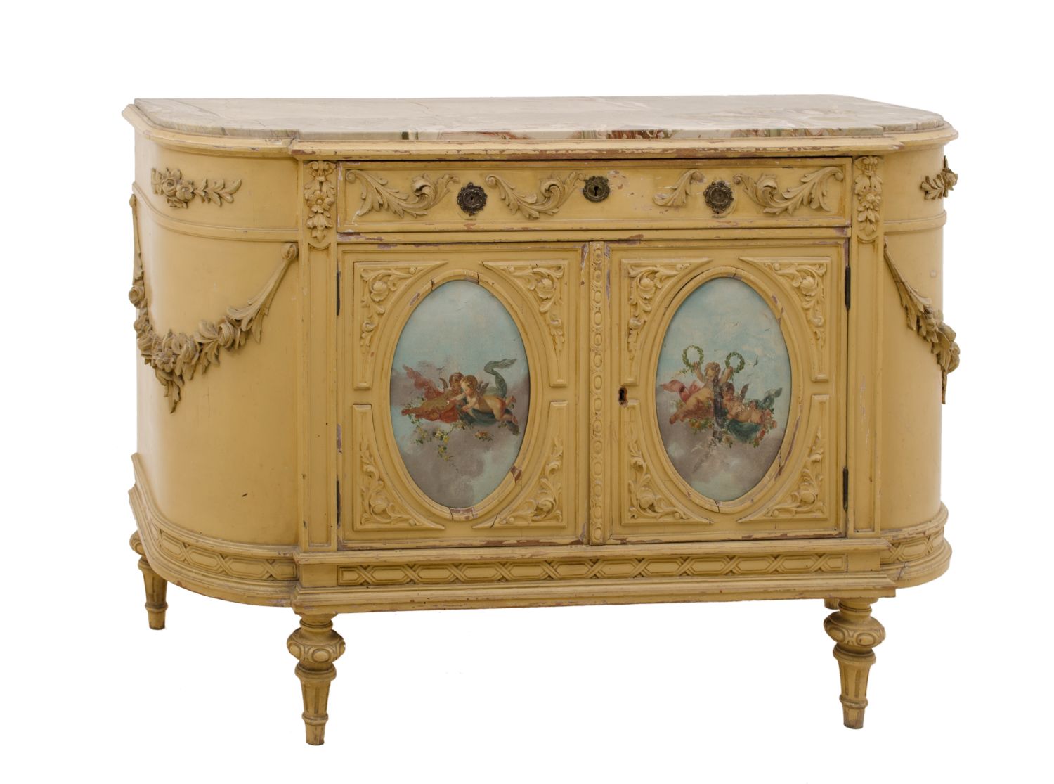 CREDENZA in legno laccato e dipinto a mano con medaglioni centrali raffiguranti "putti", piano in marmo diaspro siciliano. Sicilia primi '900 Misure: cm 131 x 53 x h 87