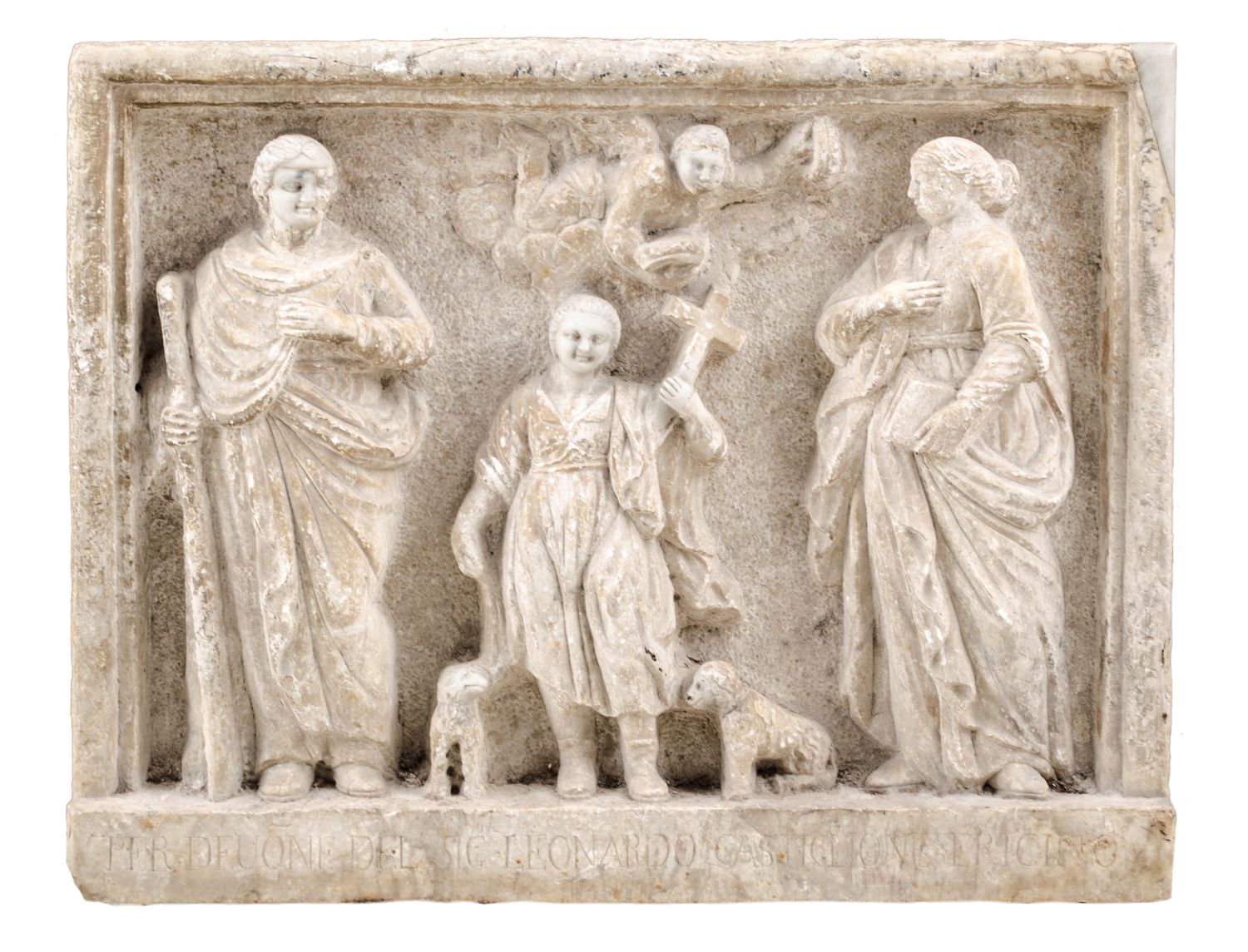 ICONA votiva in marmo raffigurante "San Vito martire con San Giuseppe e la Madonna". Sicilia XVI secolo Misure: cm 71 x 15 x h 5,5