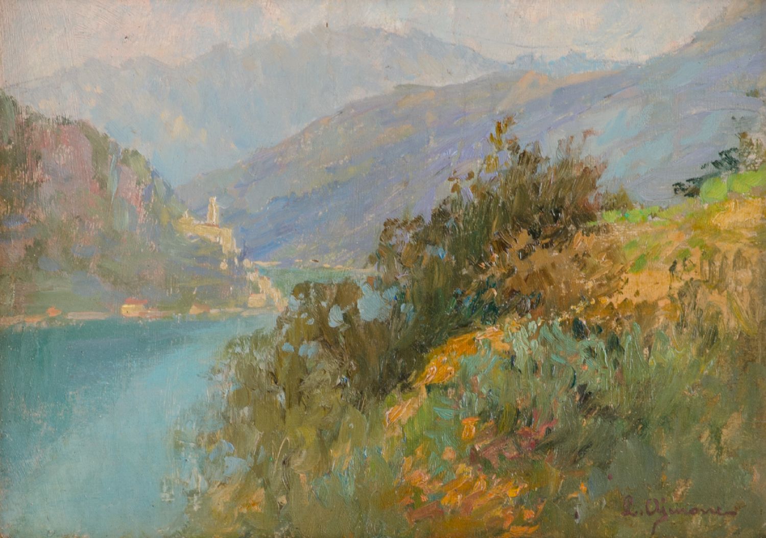 LIDIO AJMONE (Attr.le) (Coggiola (BI) 1884 - Andezeno (To) 1945) OLIO su cartone "lago di Lucano", firmato in basso a destra. Misure: cm 30 x 22n5