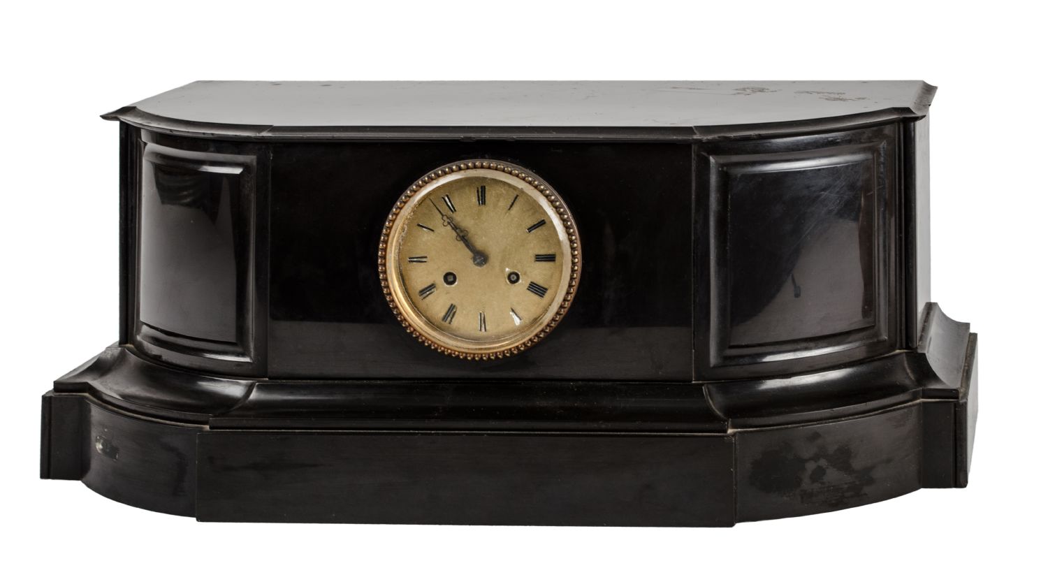 OROLOGIO in marmo nero con quadrante in ottone. Primi '900 Misure: cm 62,5 x 27 x h 26