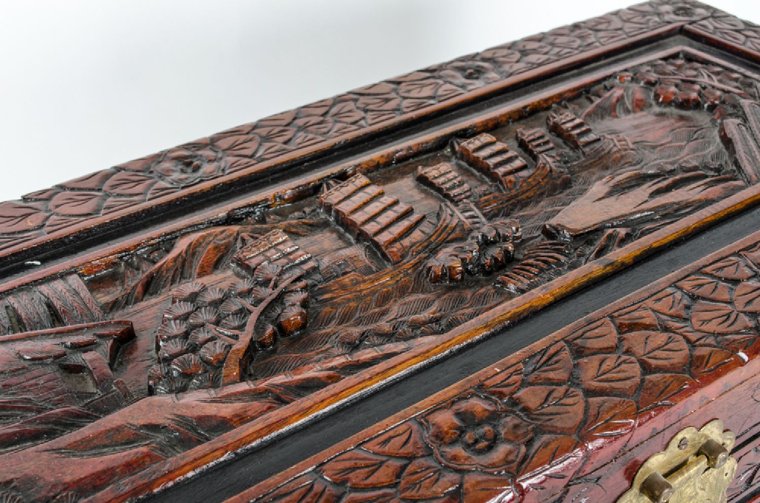 CASSA orientale in mogano riccamente intagliato. Meta' '900 Misure: cm 70 x 32 x h 36