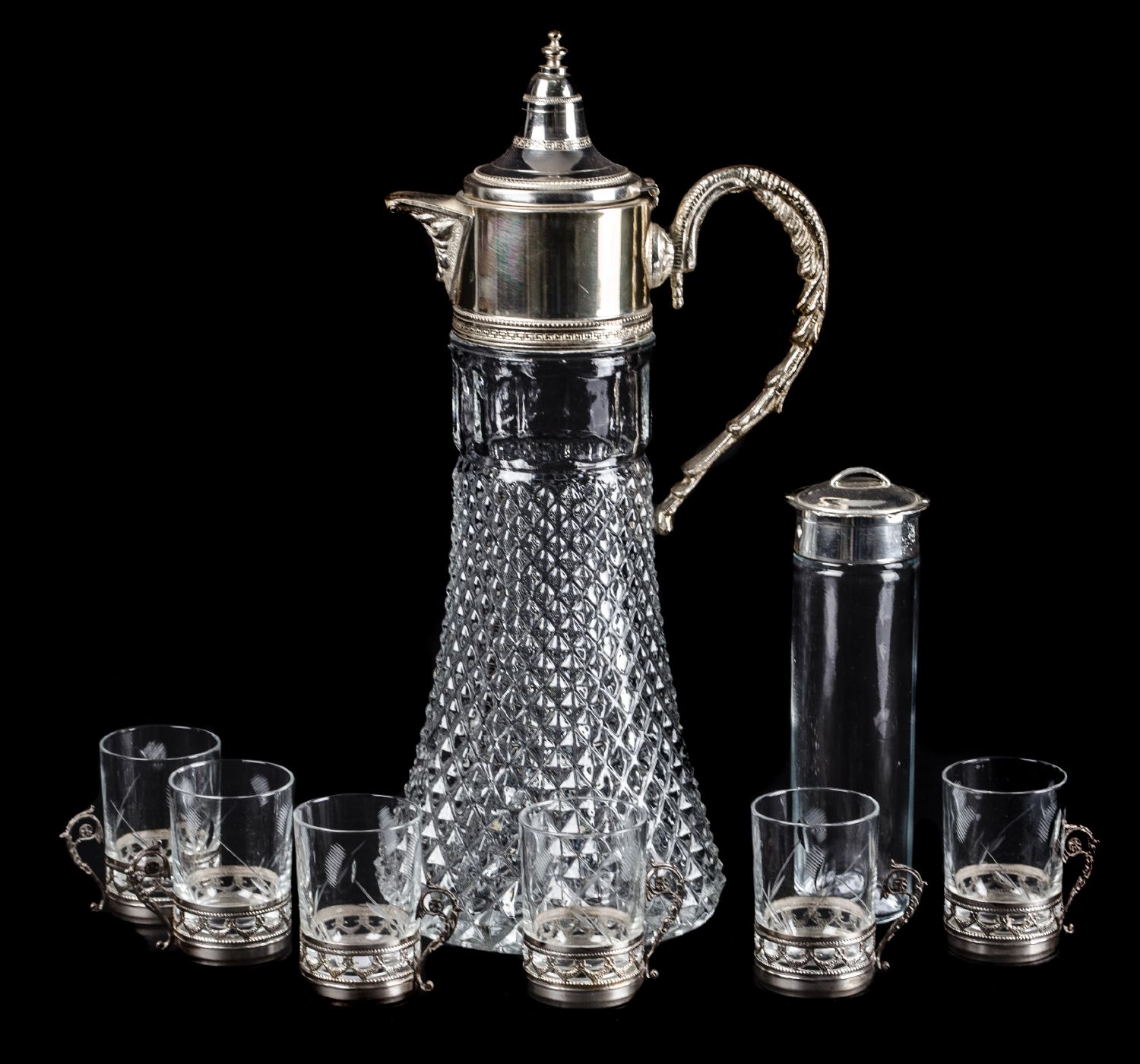 SERVIZIO da rosolio composto da BOTTIGLIA e da sei BICCHIERI in vetro e metallo argentato. Sicilia XX secolo Misure: varie