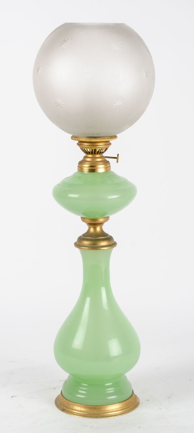 LUME in opaline con base in ottone, boccia in vetro. XX secolo Misure: h cm 64