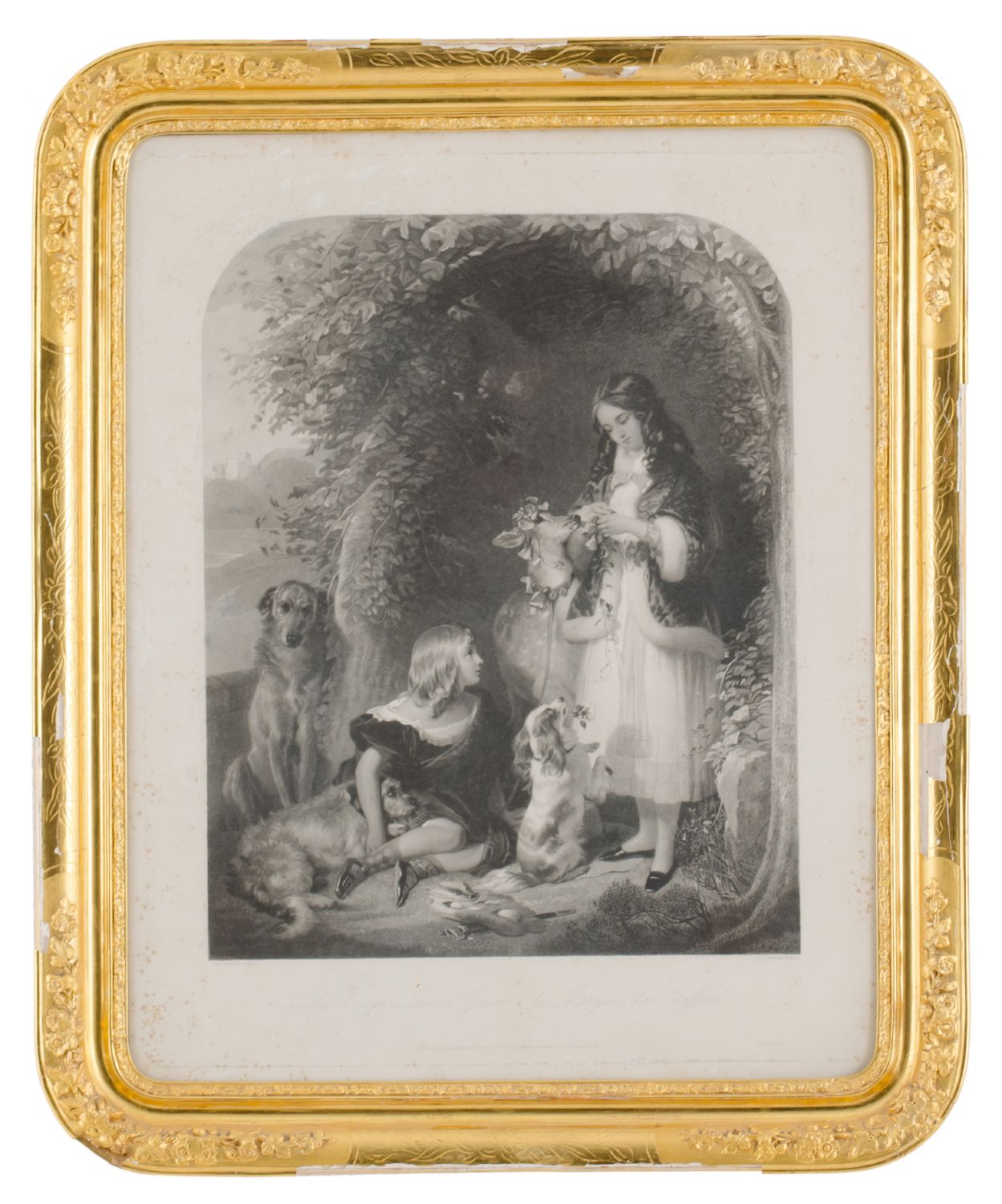 STAMPA in bianco e nero "ragazze con animali" entro cornice in legno dorato ad oro zecchino. Inghilterra fine '800 Misure: cm 70 x 85