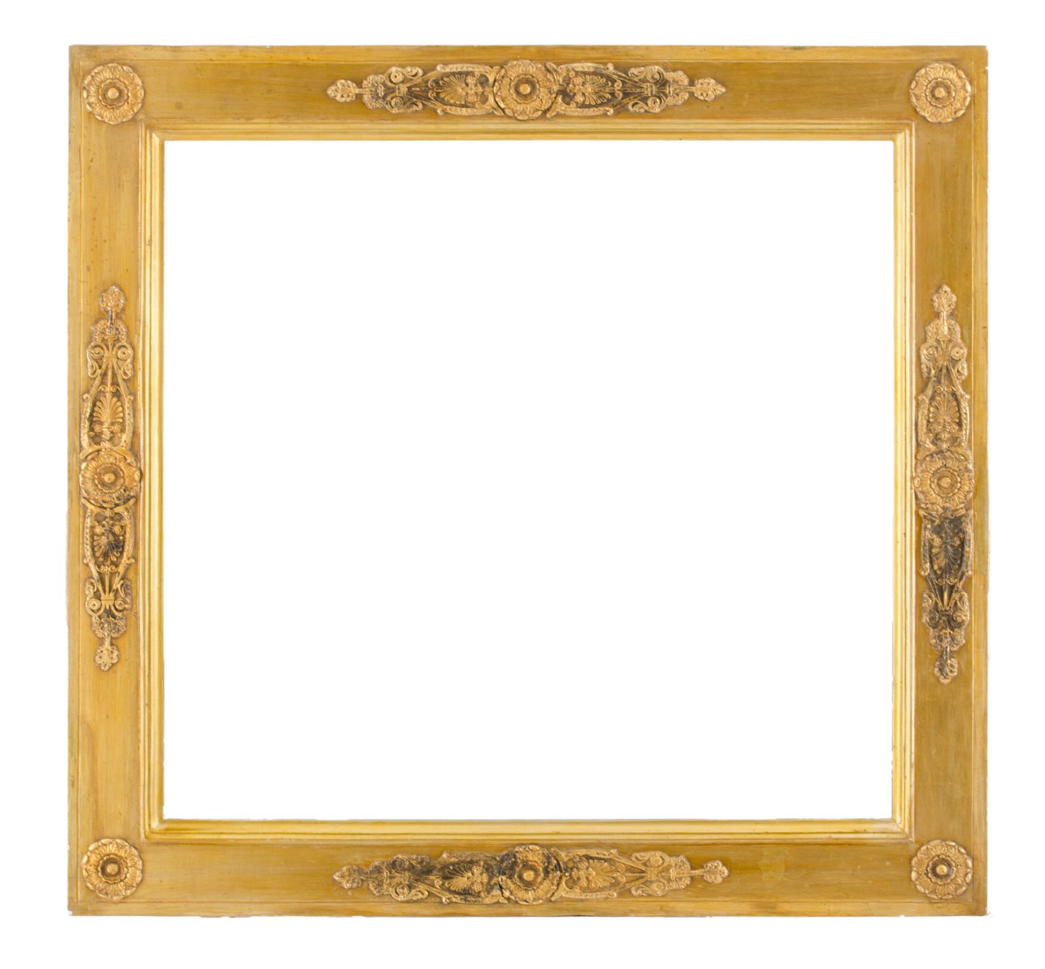 CORNICE stile Impero in legno dorato ad argento a mecca (cm 69 x 64). Sicilia...