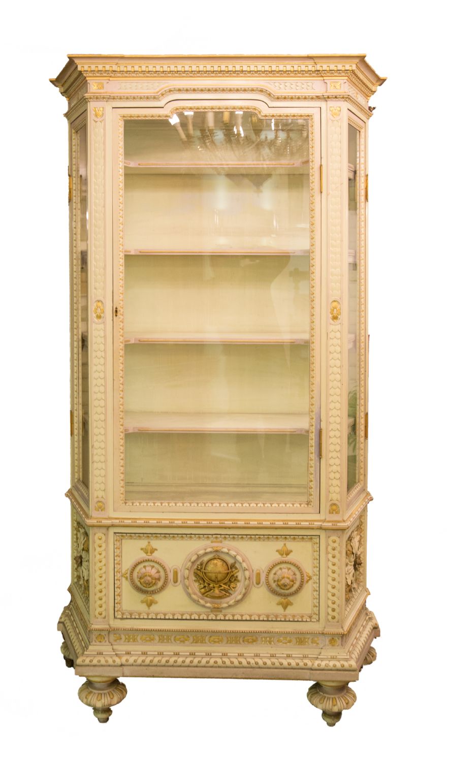 VETRINA in legno intagliato, laccato e dorato ad un'anta con cassetto...