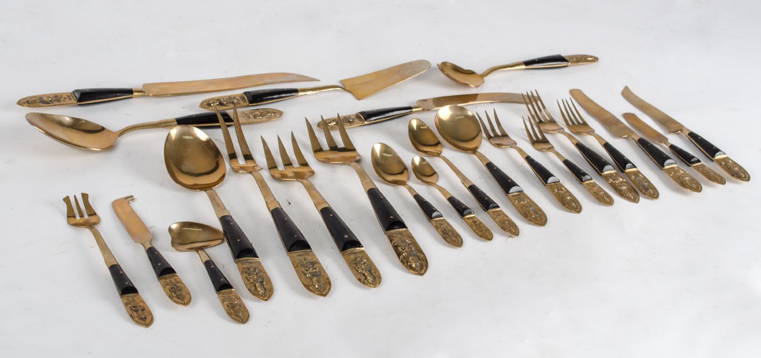 SERVIZIO POSATE con manici in legno ebanizzato in parte lavorato raffigurante...
