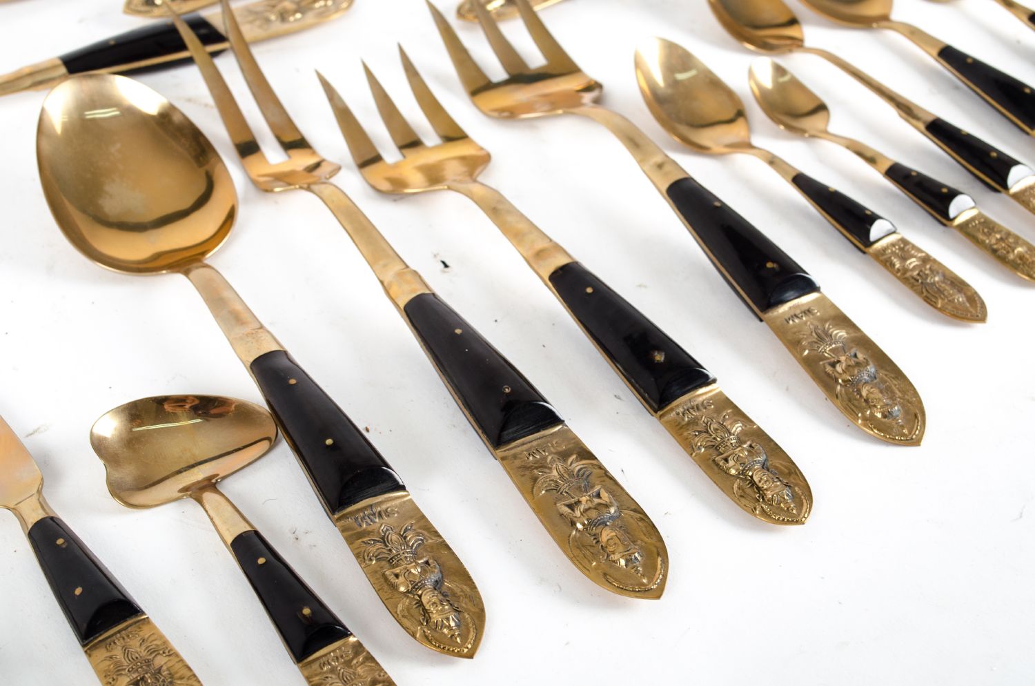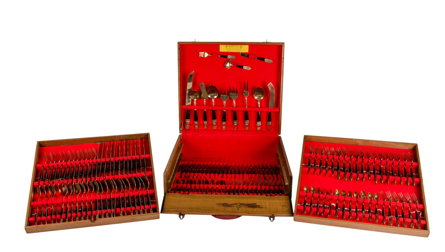 SERVIZIO POSATE con manici in legno ebanizzato in parte lavorato raffigurante "divinita' orientale" entro scatola in legno: 24 coltelli, 36 cucchiai, 12 forchette, 12 cucchiaini, 36 forchettine, 12 piccoli coltelli e da 12 posate da tavolo. XX secolo Misure: varie