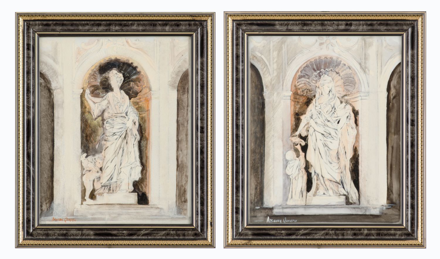 ARIANNA QUADRIO COPPIA MATTONELLE dipinte ad olio "figure femminili entro nicchie". XX secolo Misure: cm 28 x 34