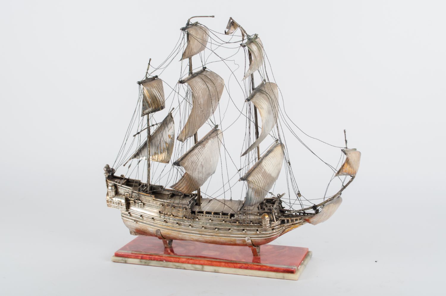 VELIERO in sfoglia d'argento con base in onice (usure). XX secolo Misure: cm 43 x 20 x h 43