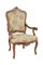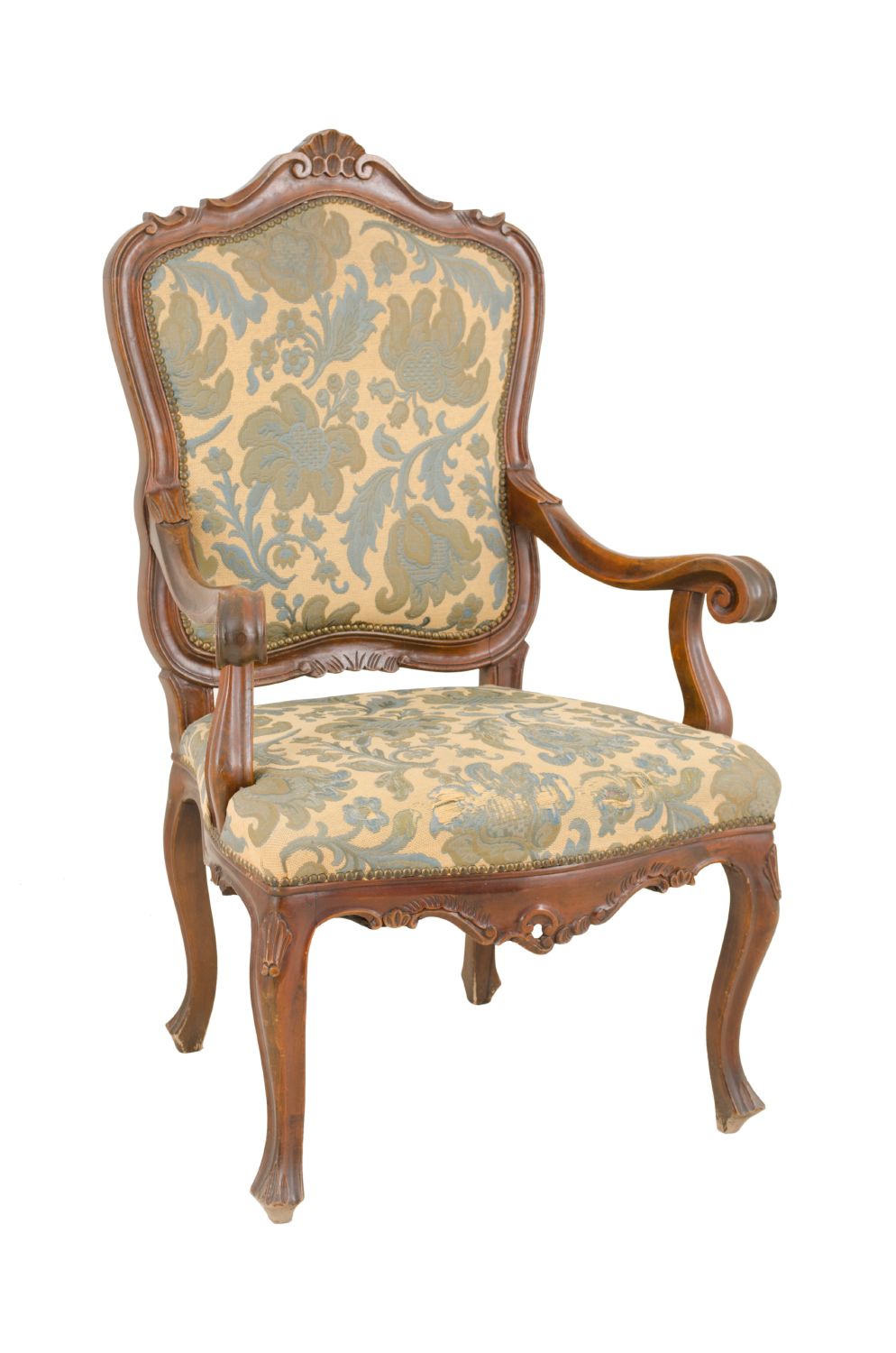 POLTRONA in noce con seduta e spalliera in stoffa a motivo floreale. XX...