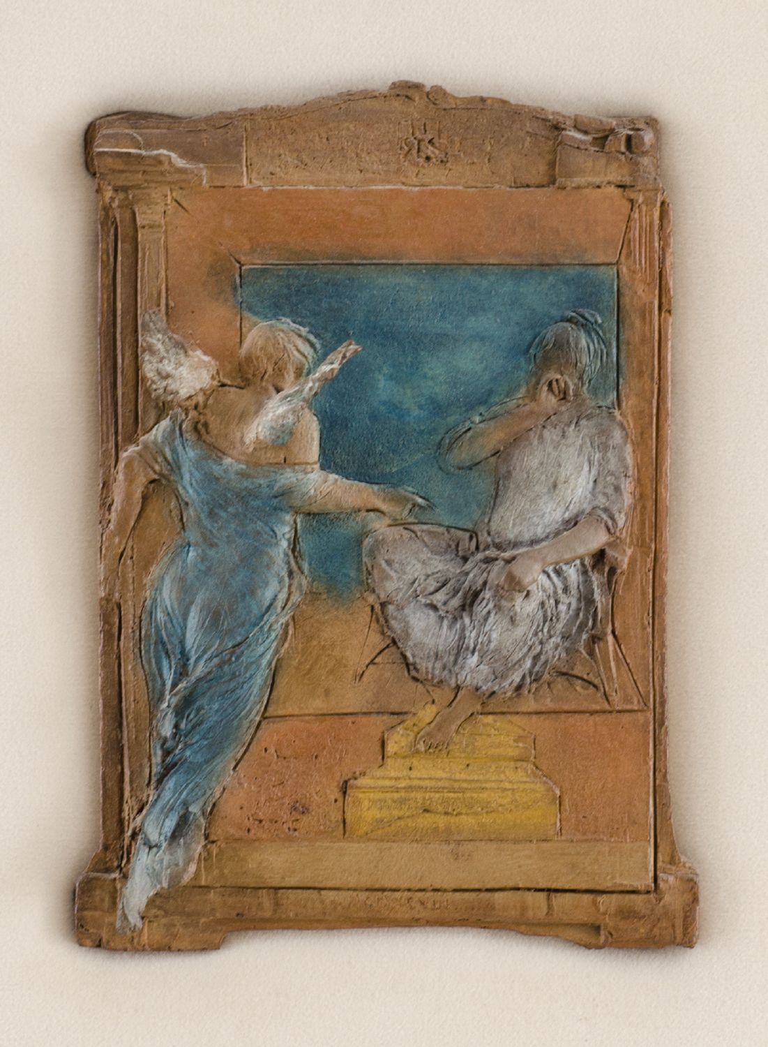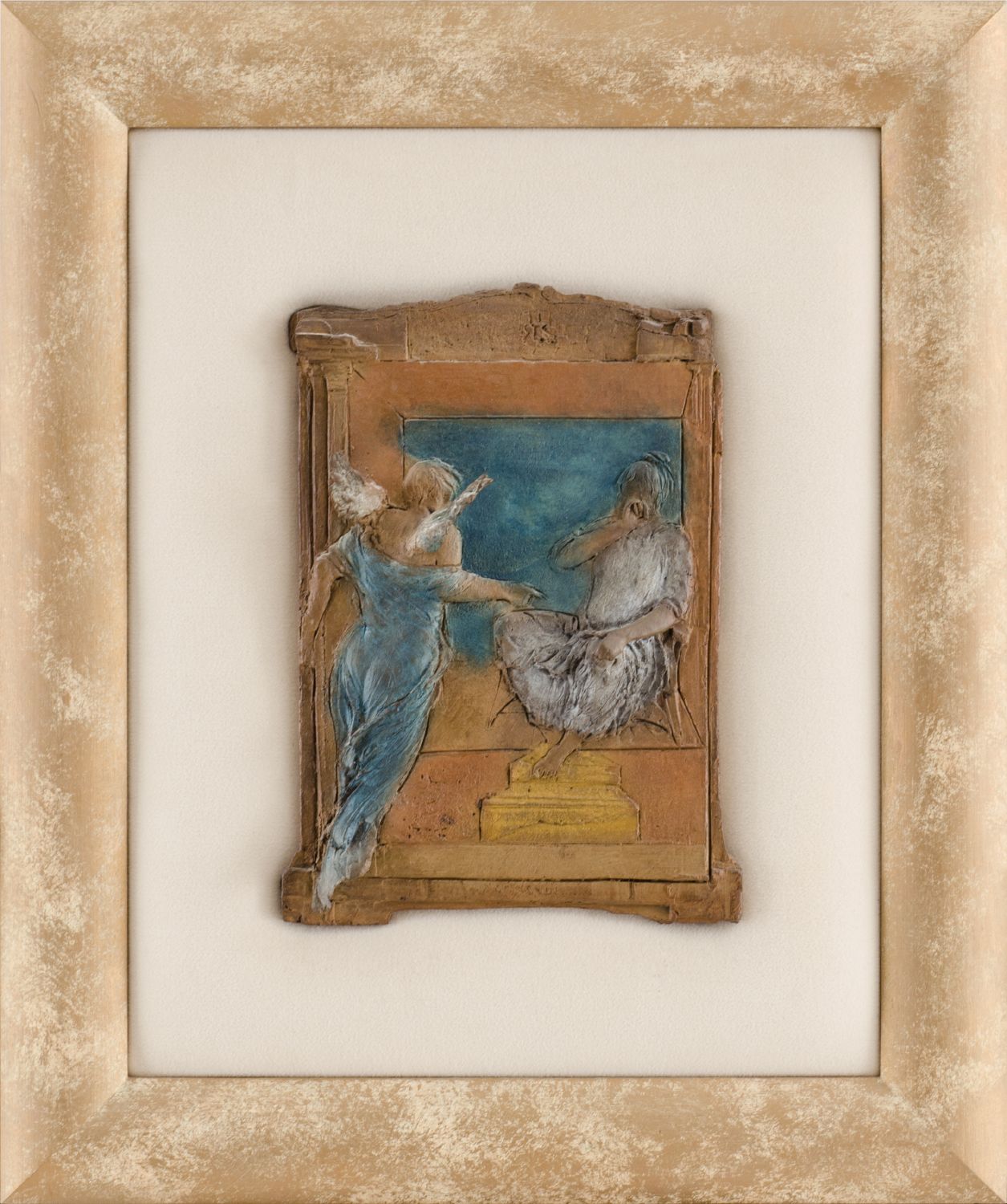 UGO RIVA (Bergamo 1951) BASSORILIEVO in bronzo policromo, fusione a cera persa "l'annuncio", esemplare 33/195 (con certificato di autenticita' e provenienza Art'E'). Datato 2000 Misure: cm 21,5 x 30,5