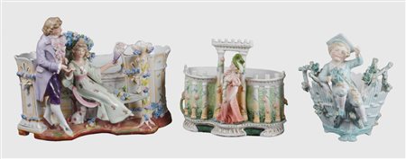 LOTTO composto da FIORIERA in porcellana dipinta a mano con scultura raffigurante "scena galante" e da due FIORIERE in biscuit dipinto a mano raffiguranti "fanciullo" e "fanciulla alla finestra". Francia meta' '900 Misure: varie