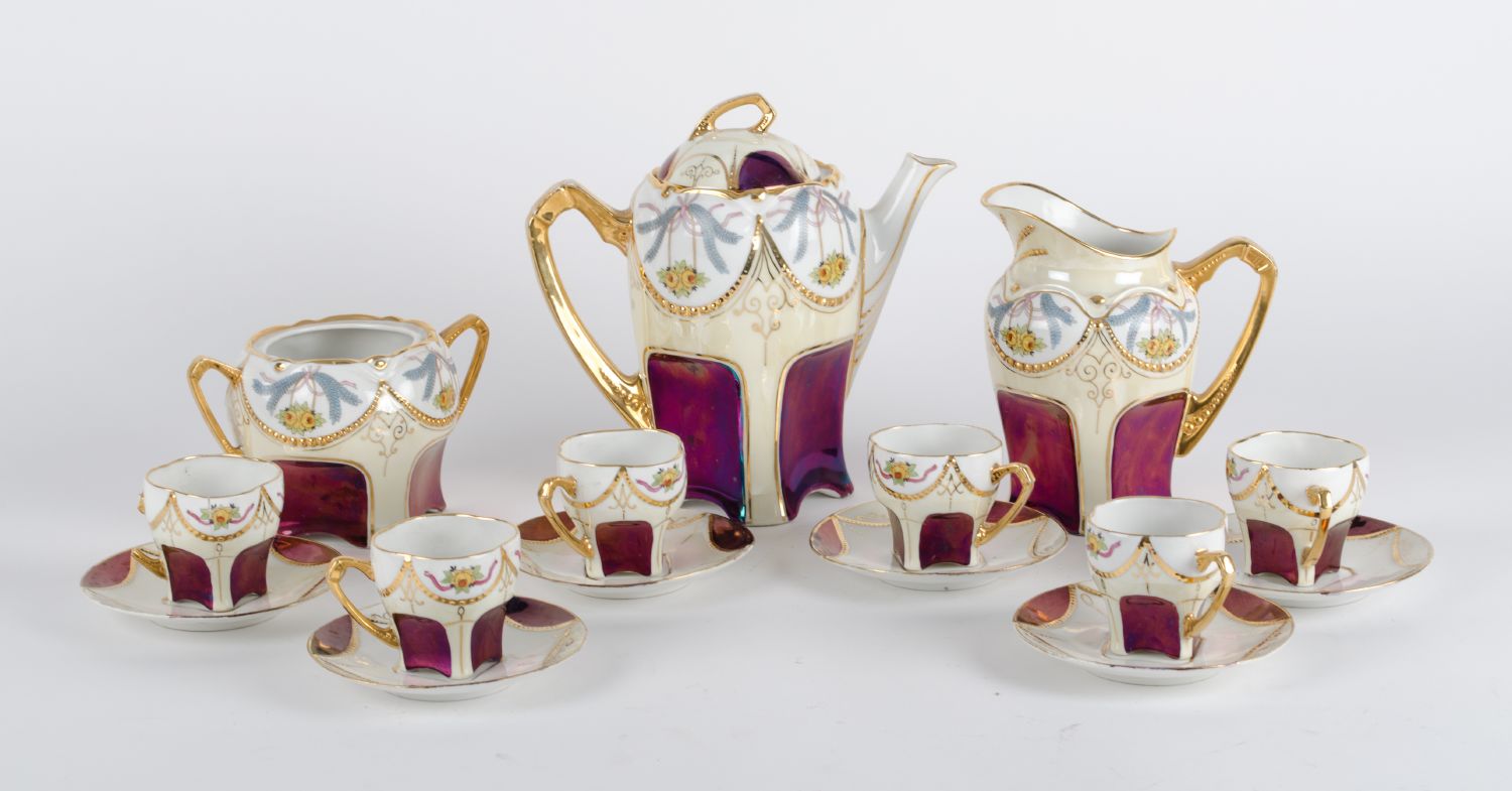 SERVIZIO da caffe' Liberty in porcellana composto da CAFFETTIERA, LATTIERA, ZUCCHERIERA (senza coperchio) e da sei TAZZINE con piattini. XX secolo Misure: varie
