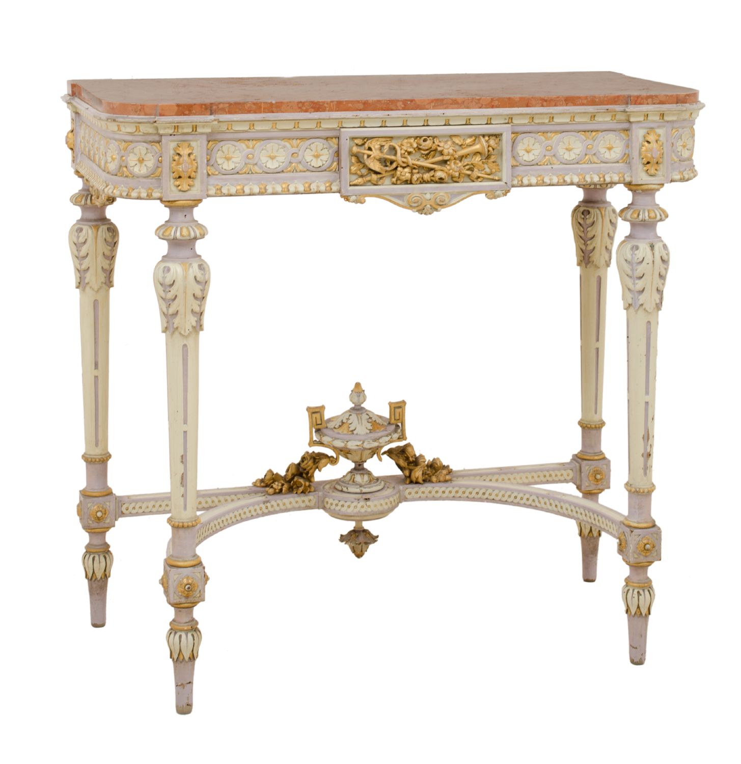 CONSOLE in legno intagliato laccato e dorato con piano in marmo rosso di...