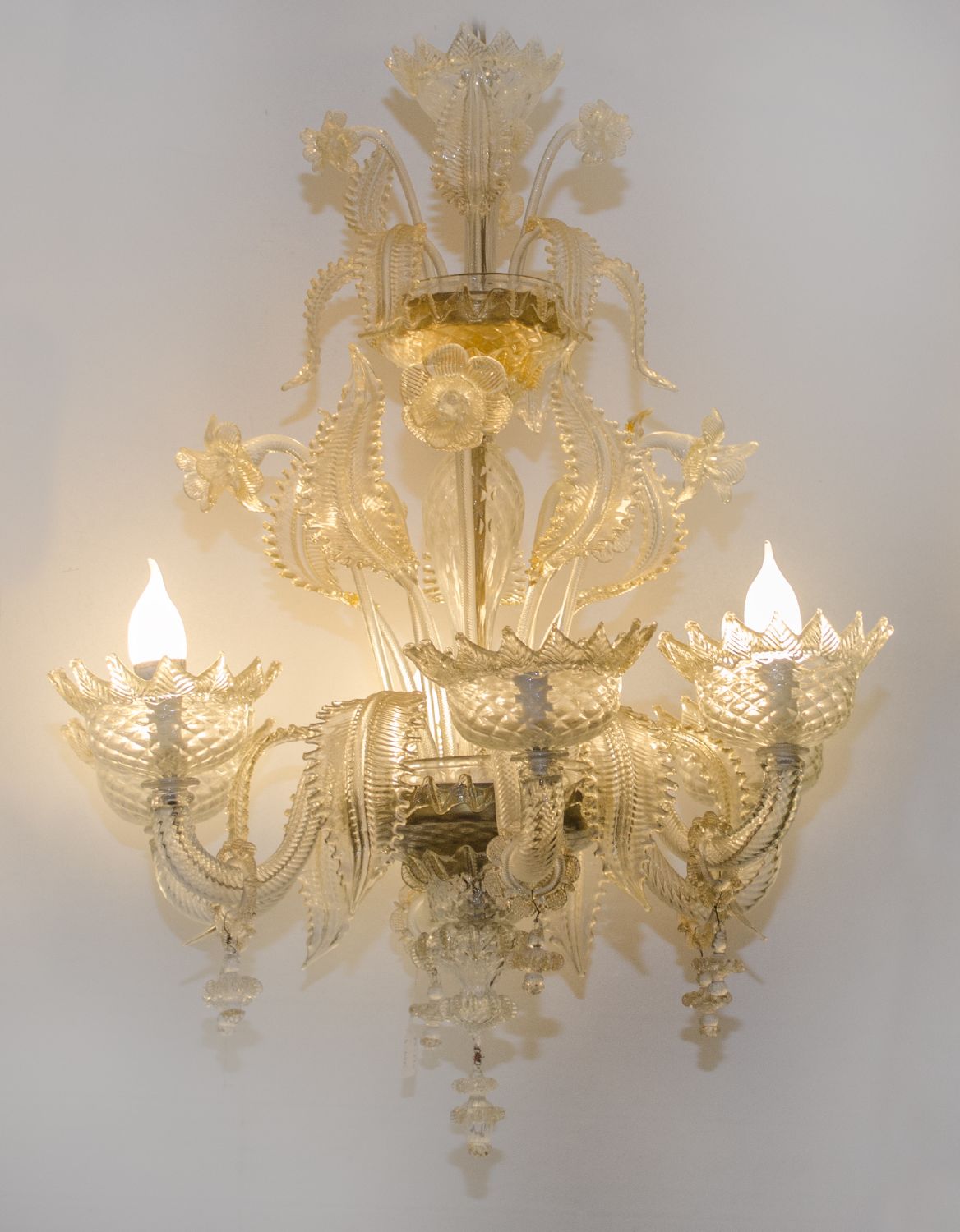 LAMPADARIO a sei luci in vetro Murano con coppette bianco e oro. XX secolo...