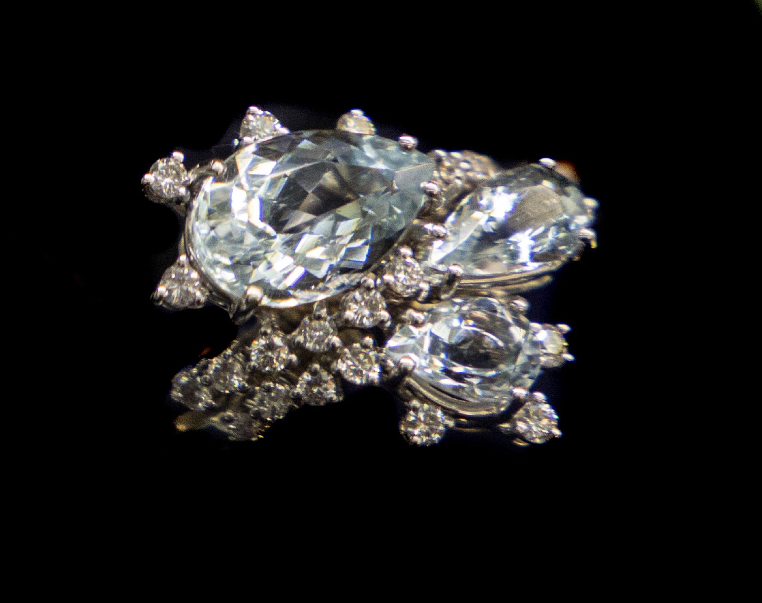 ANELLO in oro bianco 18 Kt. con brillantini (Ct. 0.93) e 3 acquamarine (Ct. 5.60).