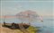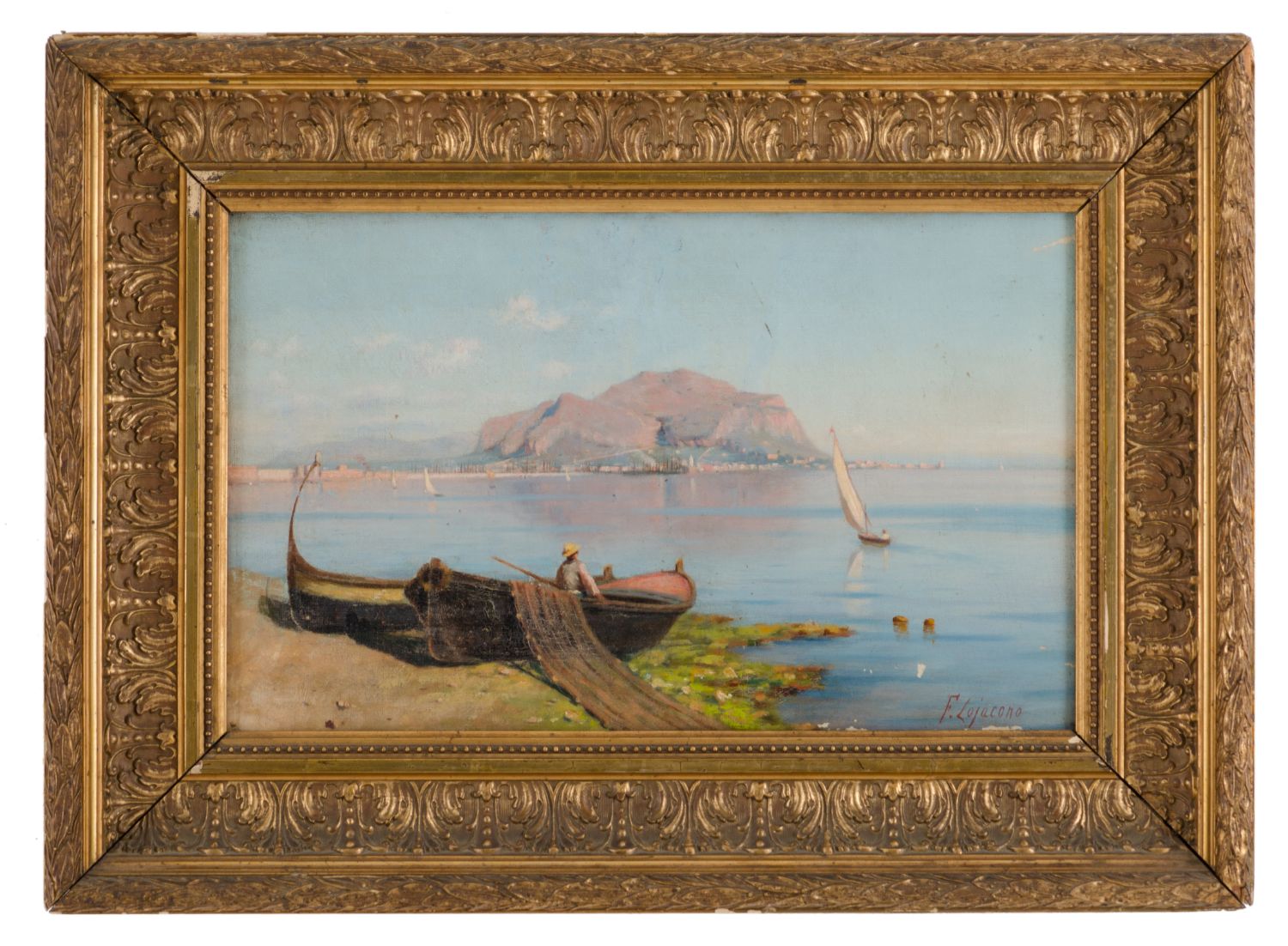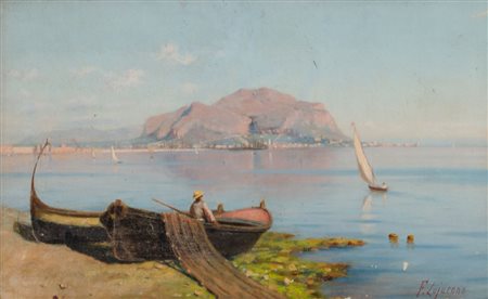 FRANCESCO LOJACONO (Palermo 1838 - 1915) OLIO su tela "marina con pescatori e veduta di Monte Pellegrino" (opera giovanile). Misure: cm 48 x 30