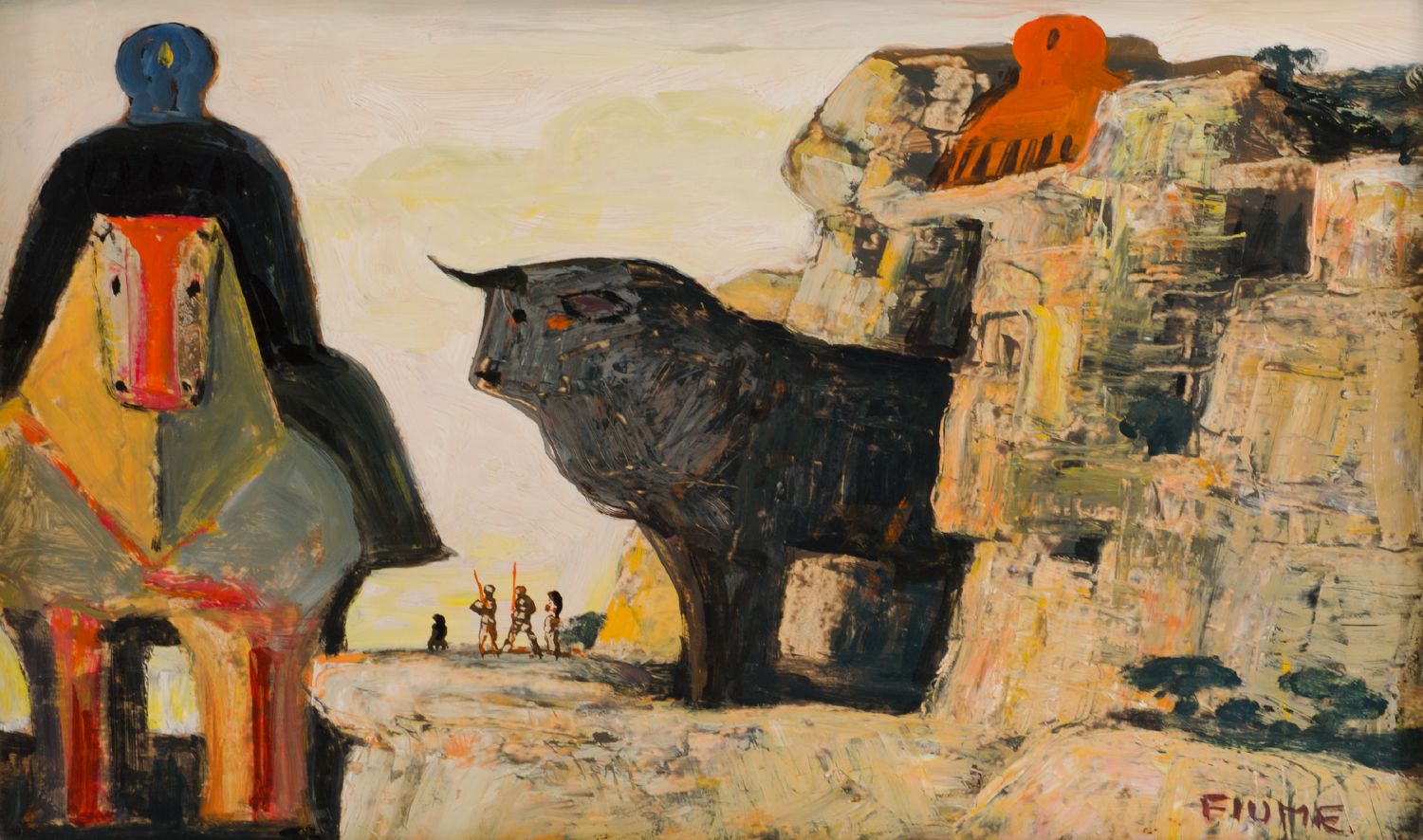 SALVATORE FIUME (Comiso 1915 - Milano 1997) OLIO su masonite "ipotetica preistoria" con autentica dell'artista su foto, firmato in basso a destra. Misure: cm 56 x 38