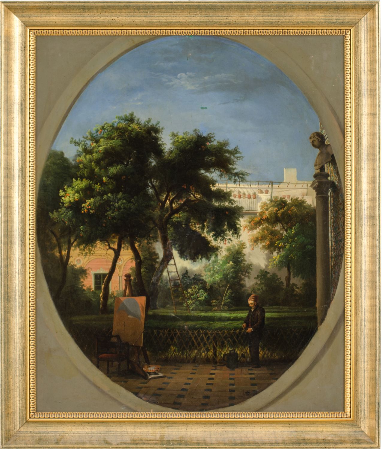 MICHELE TEDESCO (Moliterno (Pz) 1834 - Napoli 1918) OLIO su tela "esterno di villa con personaggio", firmato in basso. Misure: cm 76 x 93
