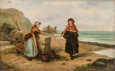 F. J. TURNER OLIO su tela "popolane in riva al mare". Primi '900 Misure: cm 76 x 51