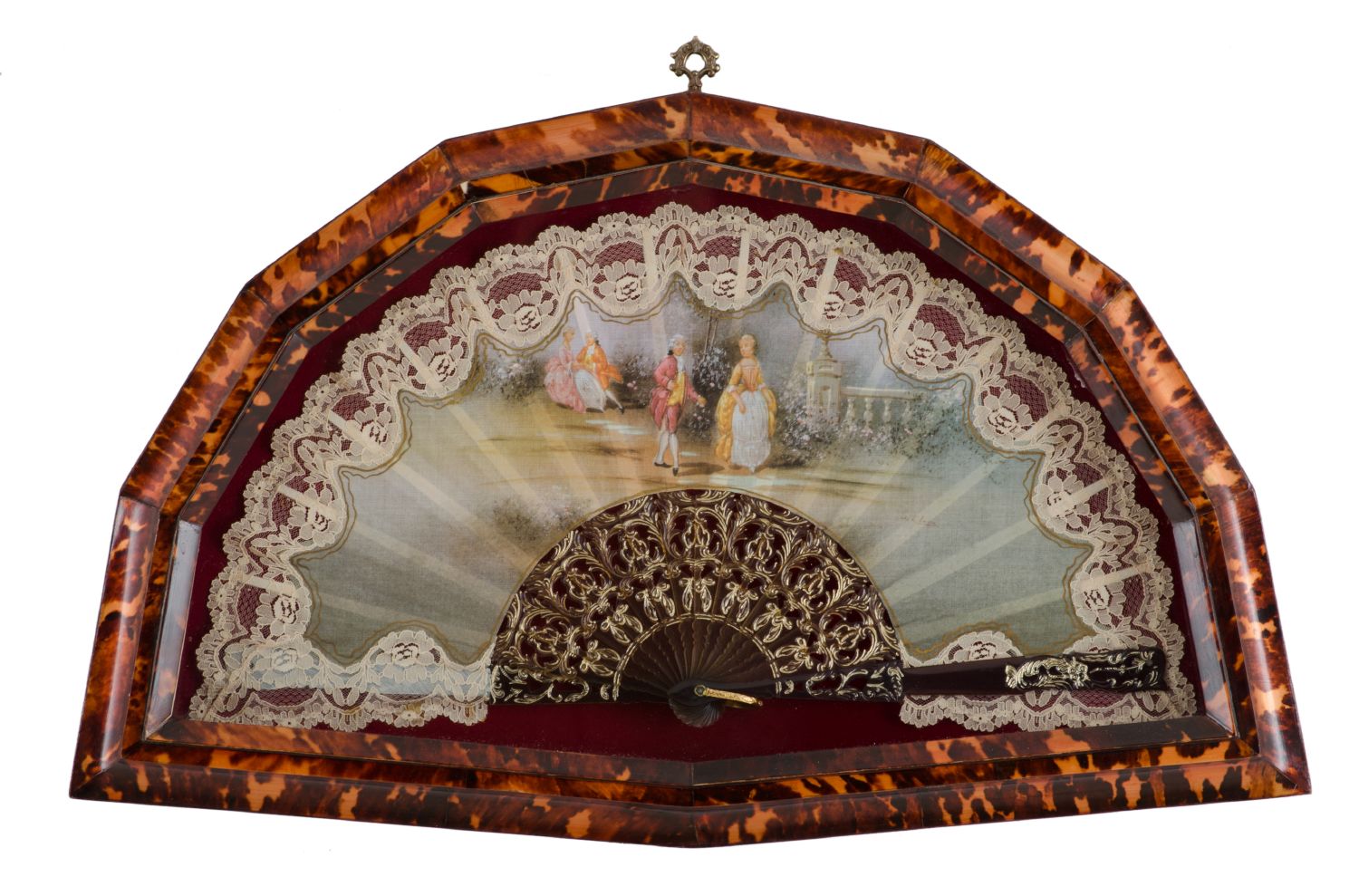 VENTAGLIO in stoffa dipinta raffigurante "scena galante" entro teca in...