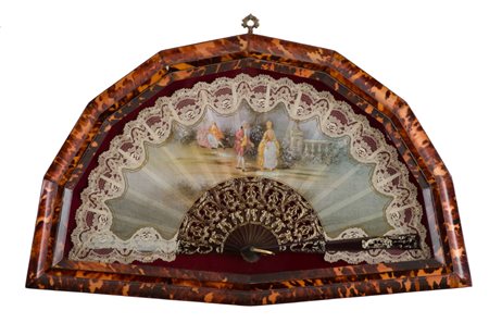 VENTAGLIO in stoffa dipinta raffigurante "scena galante" entro teca in tartaruga. Italia XX secolo Misure: cm 57 x 34,5