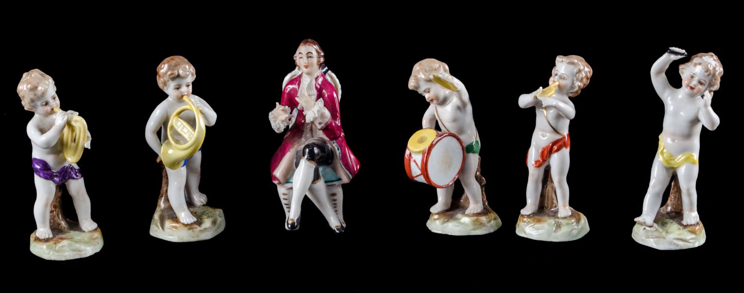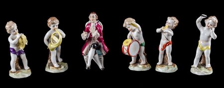 SEI SCULTURE in porcellana raffiguranti "putti" e "gentiluomo". Germania...