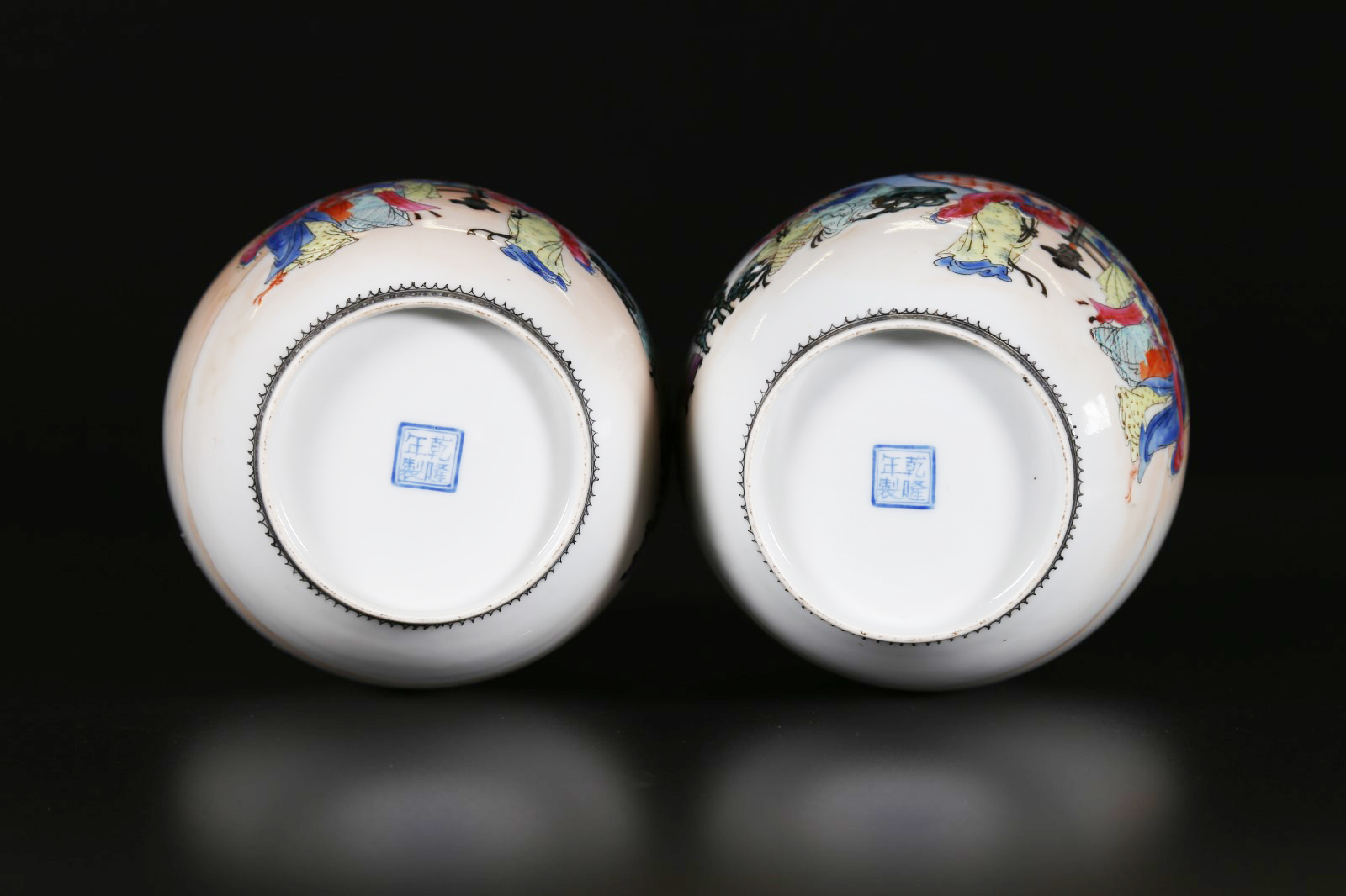 Arte Cinese Coppia di vasi in porcellana dipinta con dame di corte Cina, periodo Repubblica, XX secolo. -. Cm 10,00 x 21,00. Coppia di piccoli vasi a balaustro poggianti su disco, decorati ai margini con motivi geometrici dorati e dipinti con dame di corte, iscrizione, probabilmente relativa agli autori classici, sigillo e firma dell'artigiano Long sul corpo centrale dell'oggetto. La base reca marchio a sigillo dell'imperatore Qianlong.
