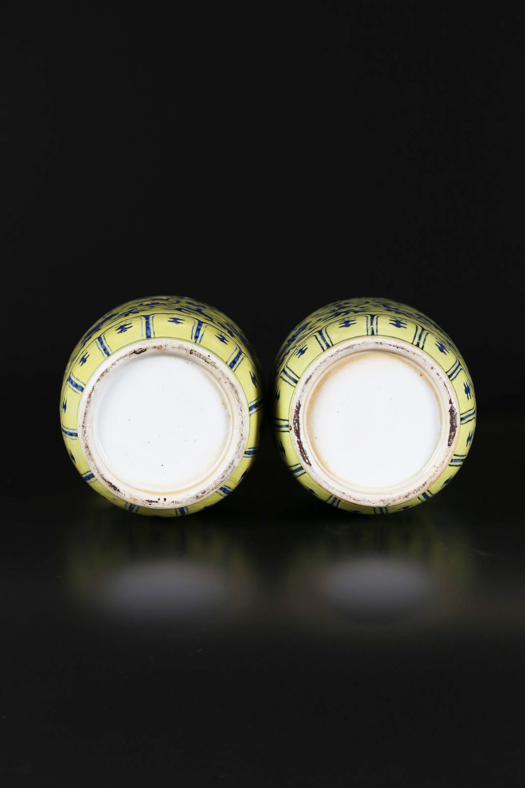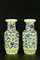 Arte Cinese Coppia di vasi in porcellana smaltata con fiori blu su fondo giallo Cina, XIX secolo. . Cm 38,00. Coppia di vasi a balaustro con collo dritto ed ampia bocca, interamente decorati con delicati fiori dipinti in blu cobalto su smalto giallo. Qualche mancanza e restauro.