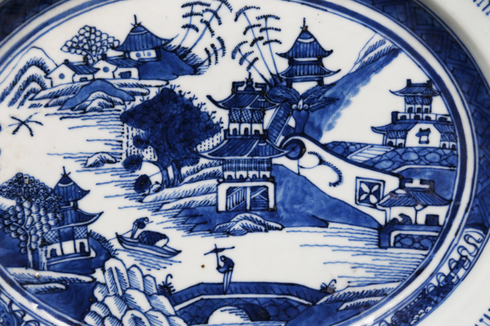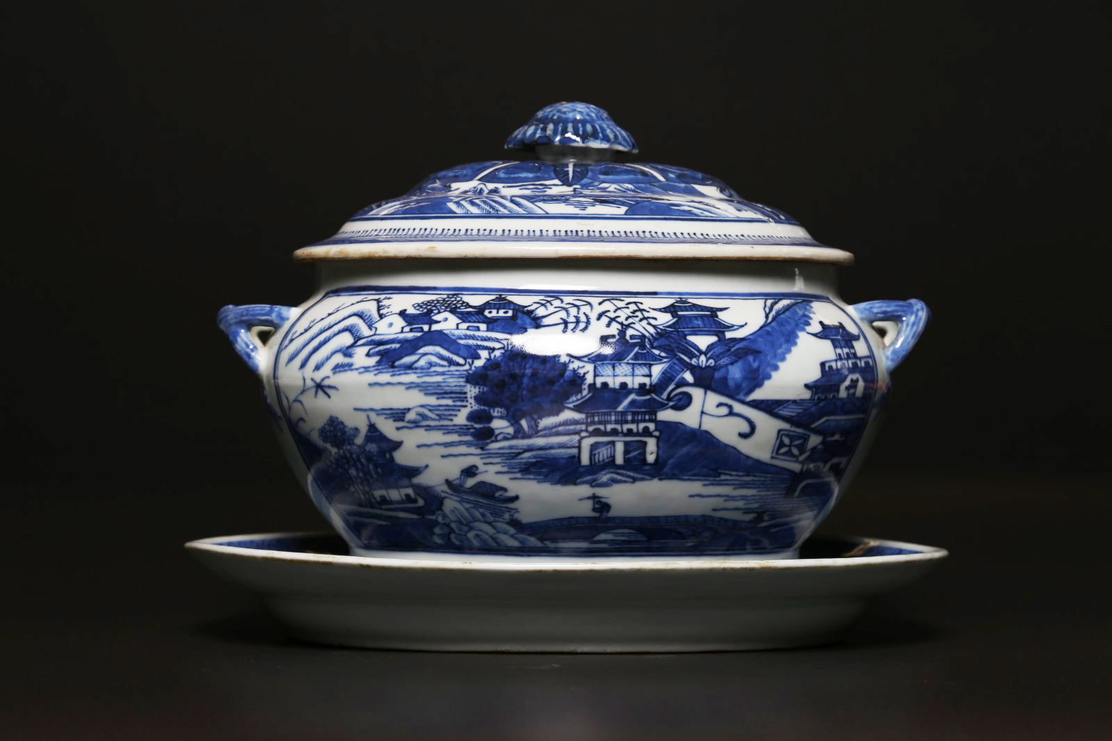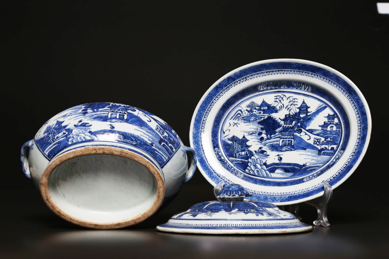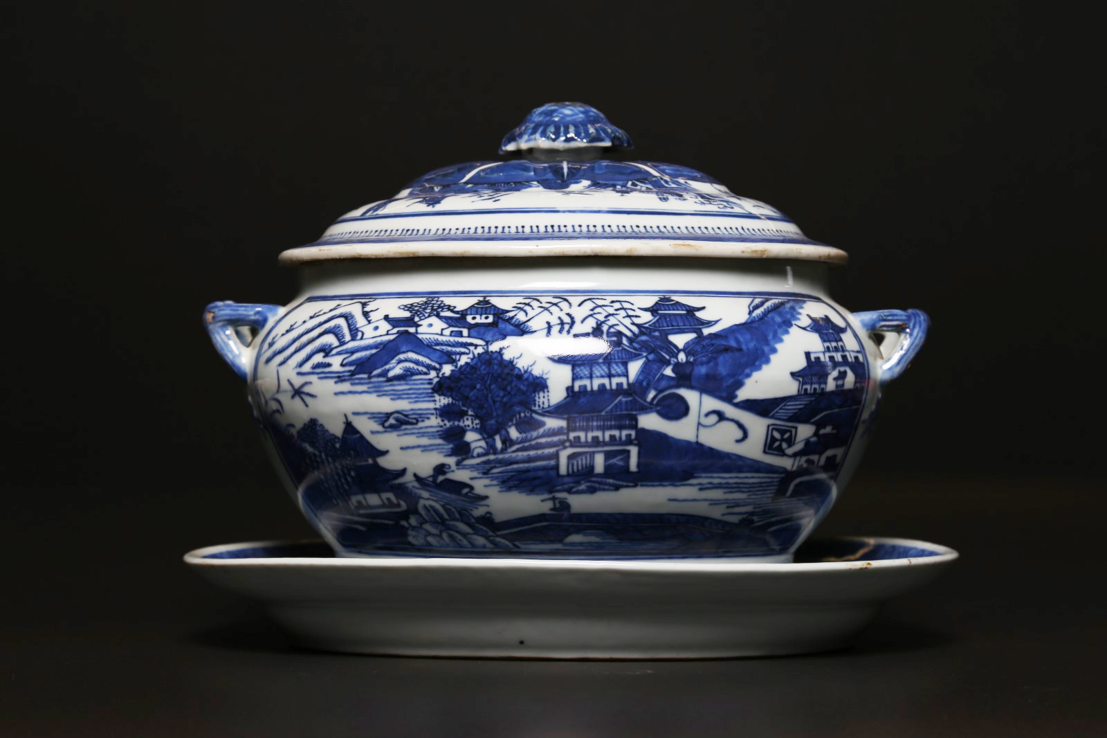 Arte Cinese Zuppiera in porcellana Bianco/blu con coperchio e vassoio. Cina, fine XVIII- inizio XIX secolo . . Cm 31,00 x 25,00. Raffinato contenitore in tre pezzi decorato con grandi riserve ovali raffiguranti un paesaggio sui lati dell'oggetto e sul coperchio che termina con impugnatura a forma di fiore.