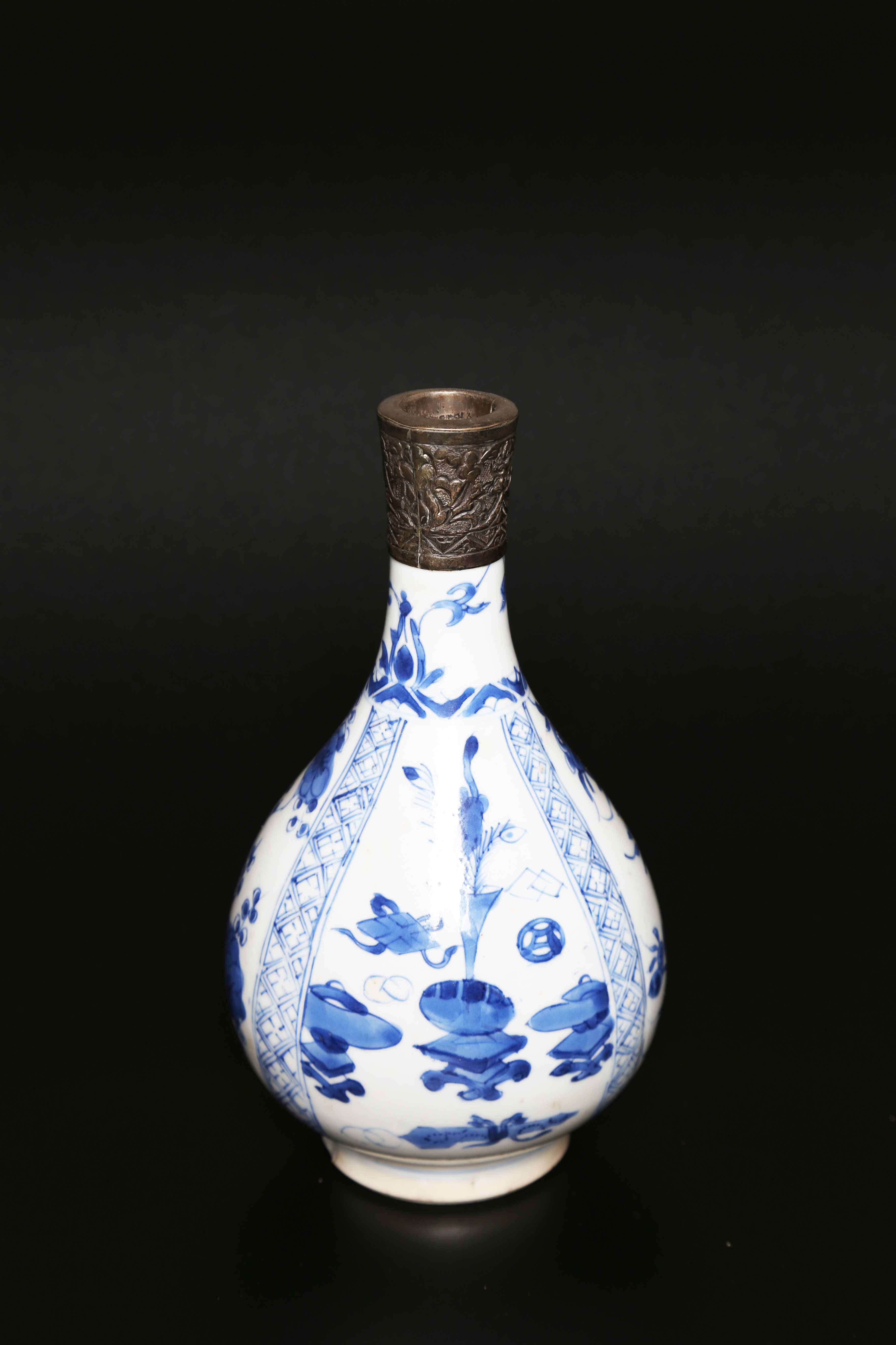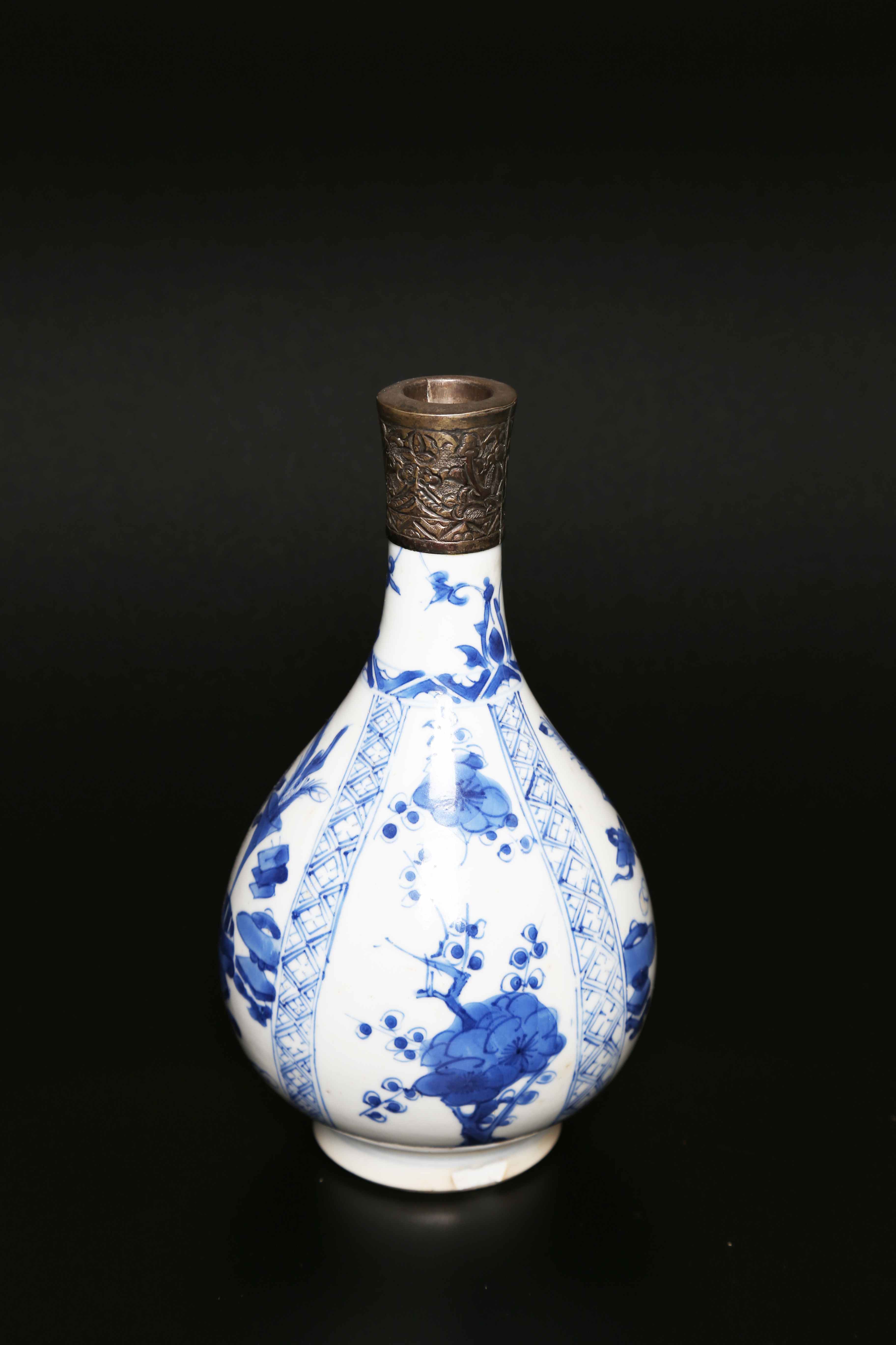 Arte Cinese Bottiglietta in porcellana bianco/blu Kanxi con montaggio islamico Cina, XVII secolo. . Cm 19,00. Bottiglia piriforme in porcellana bianco/blu della tipologia cosiddetta di transizione (1620-1663). La decorazione floreale e vegetale è suddivisa in fasce verticali separate da greche con motivi astratti. Il collo di siffatte bottiglie è sempre la parte più fragile dell'oggetto e spesso necessitava di restauri. In questo caso vi è stato applicato un finale in metallo decorato con arabeschi di tradizione islamica.