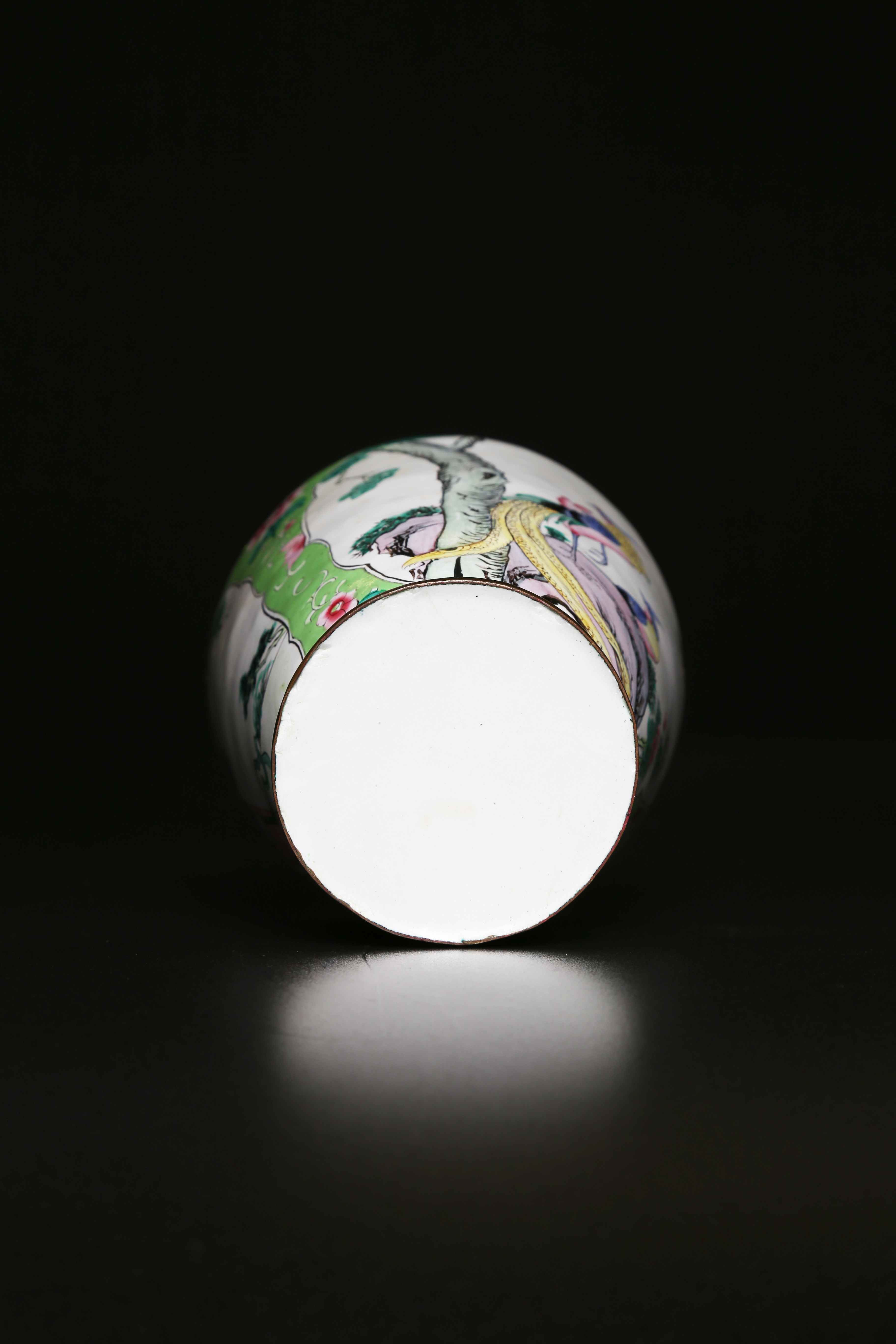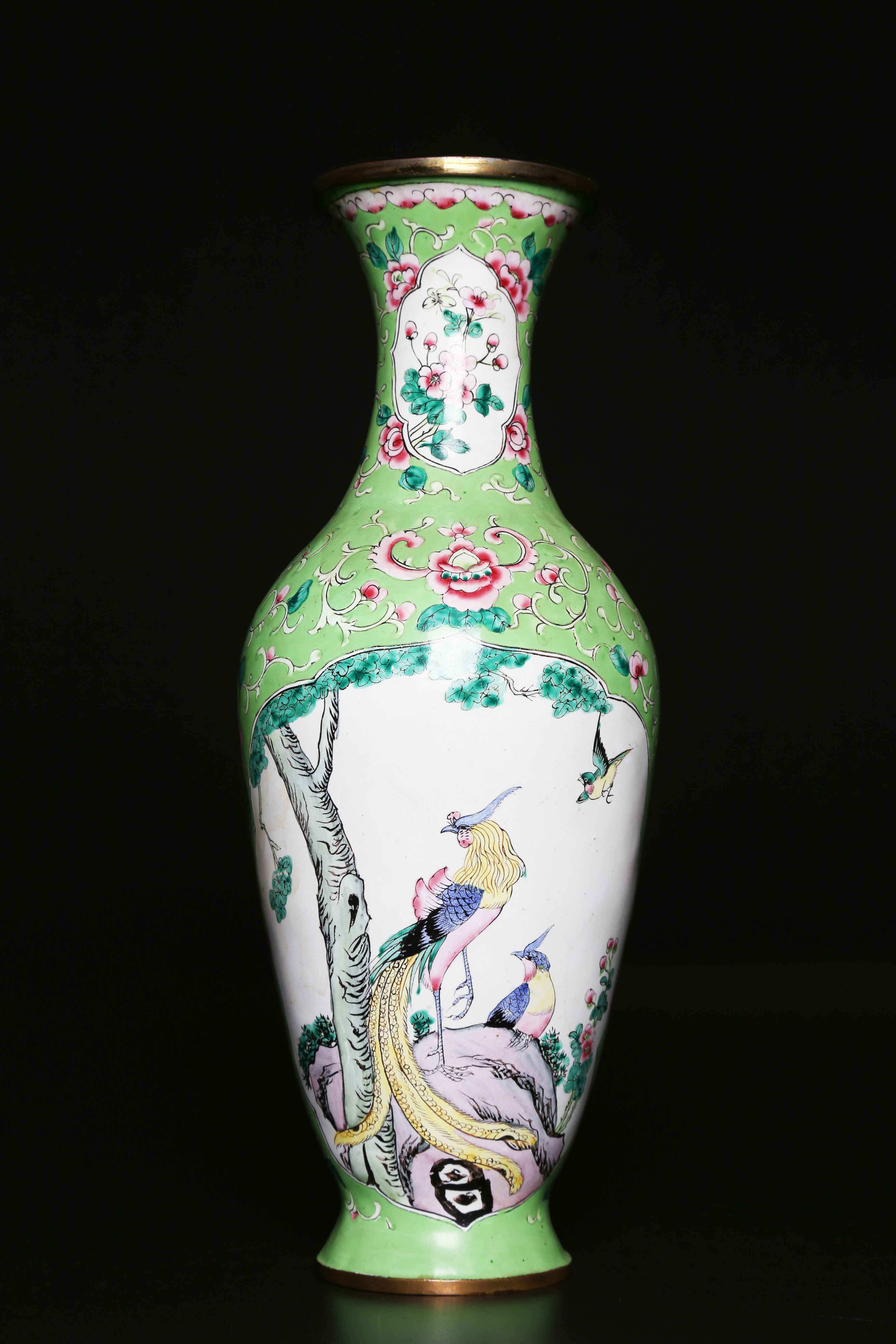 Arte Cinese Vaso smaltato Cina, dinastia Qing, fine XIX secolo. -. Cm 32,00. Sul fondo verde brillante decorato con motivi vegetali spiccano due grandi riserve lobate: l'una con volatili appoggiati su una roccia e l'altra raffigurante due dame in un giardino. Diametro bocca 8,5 cm