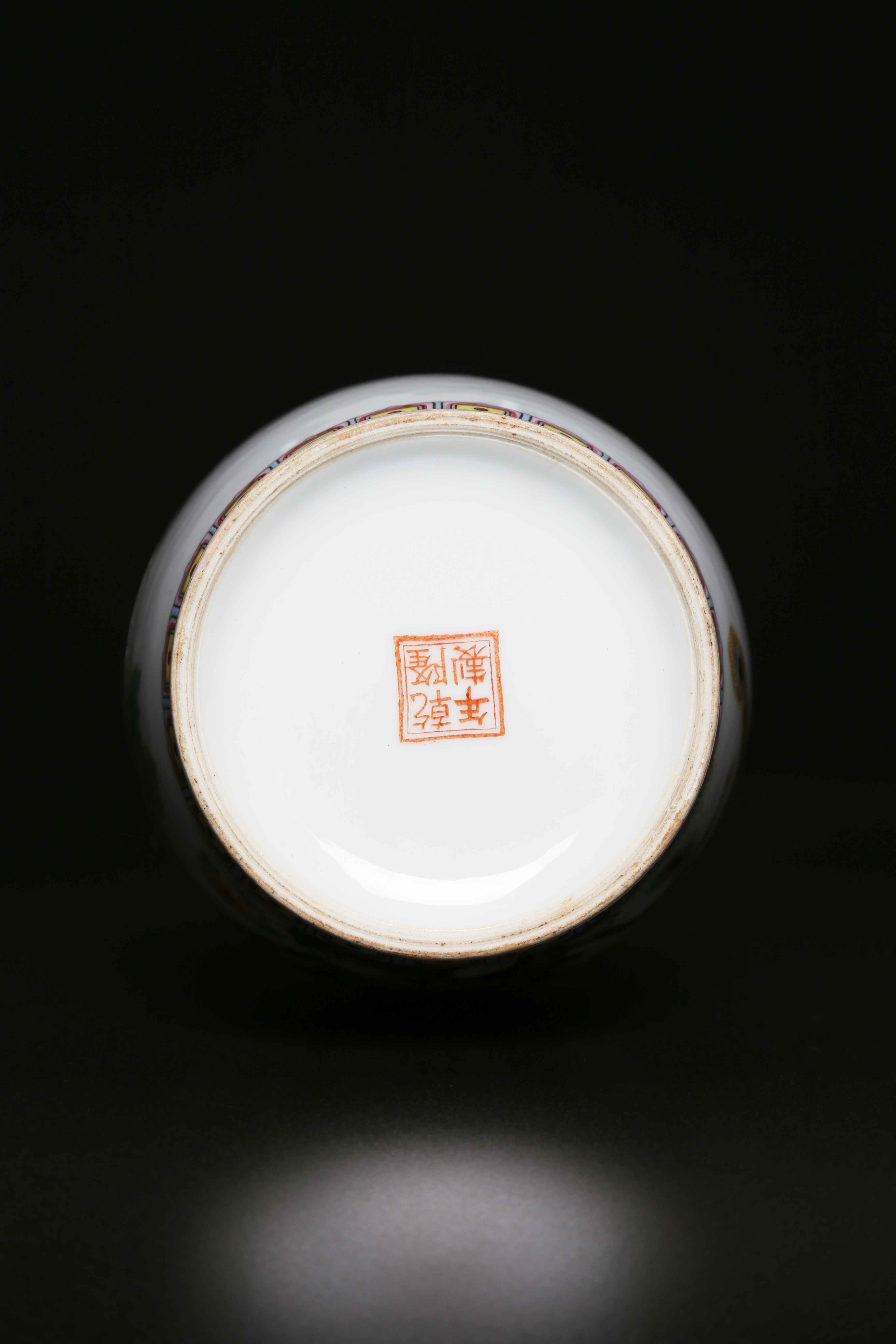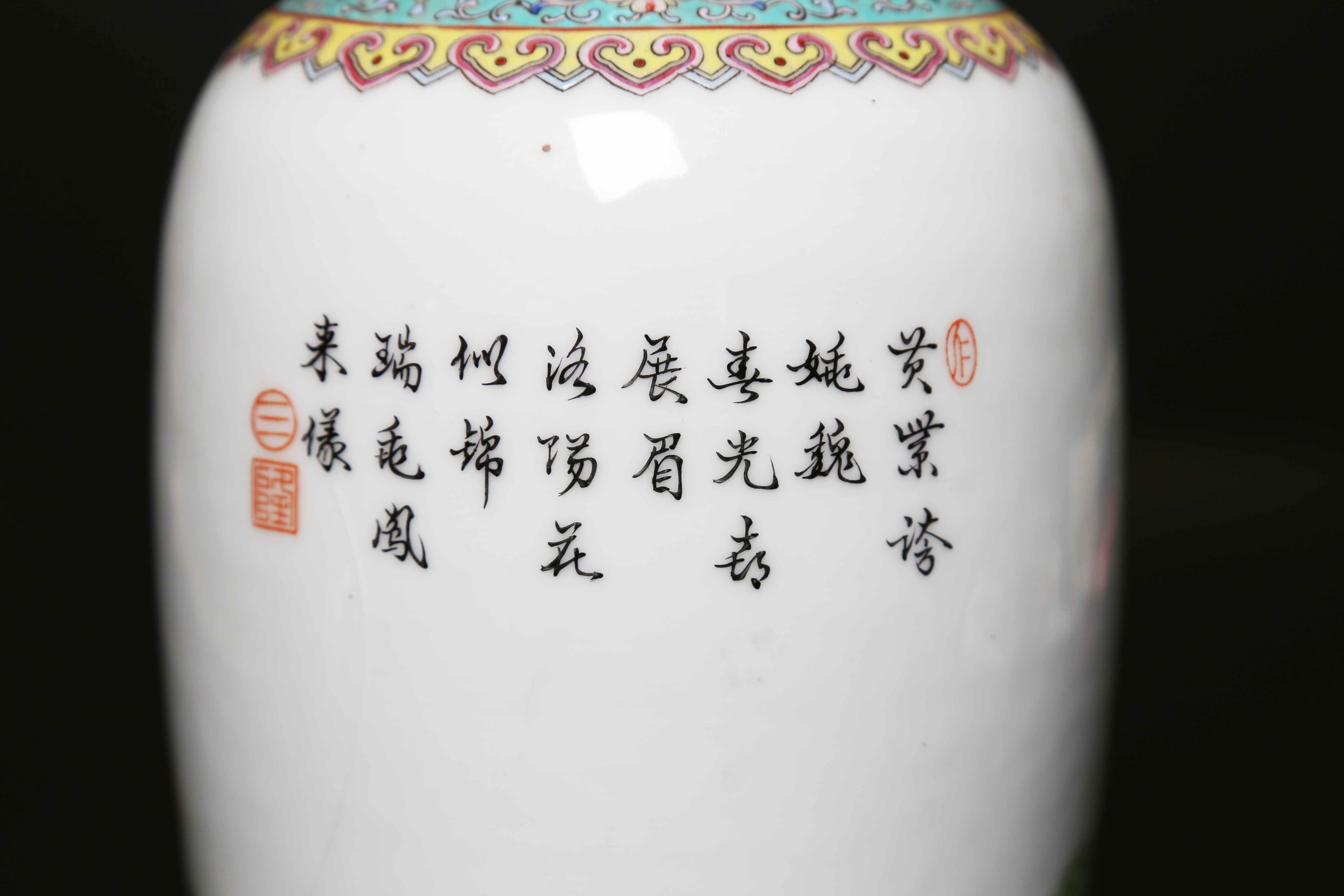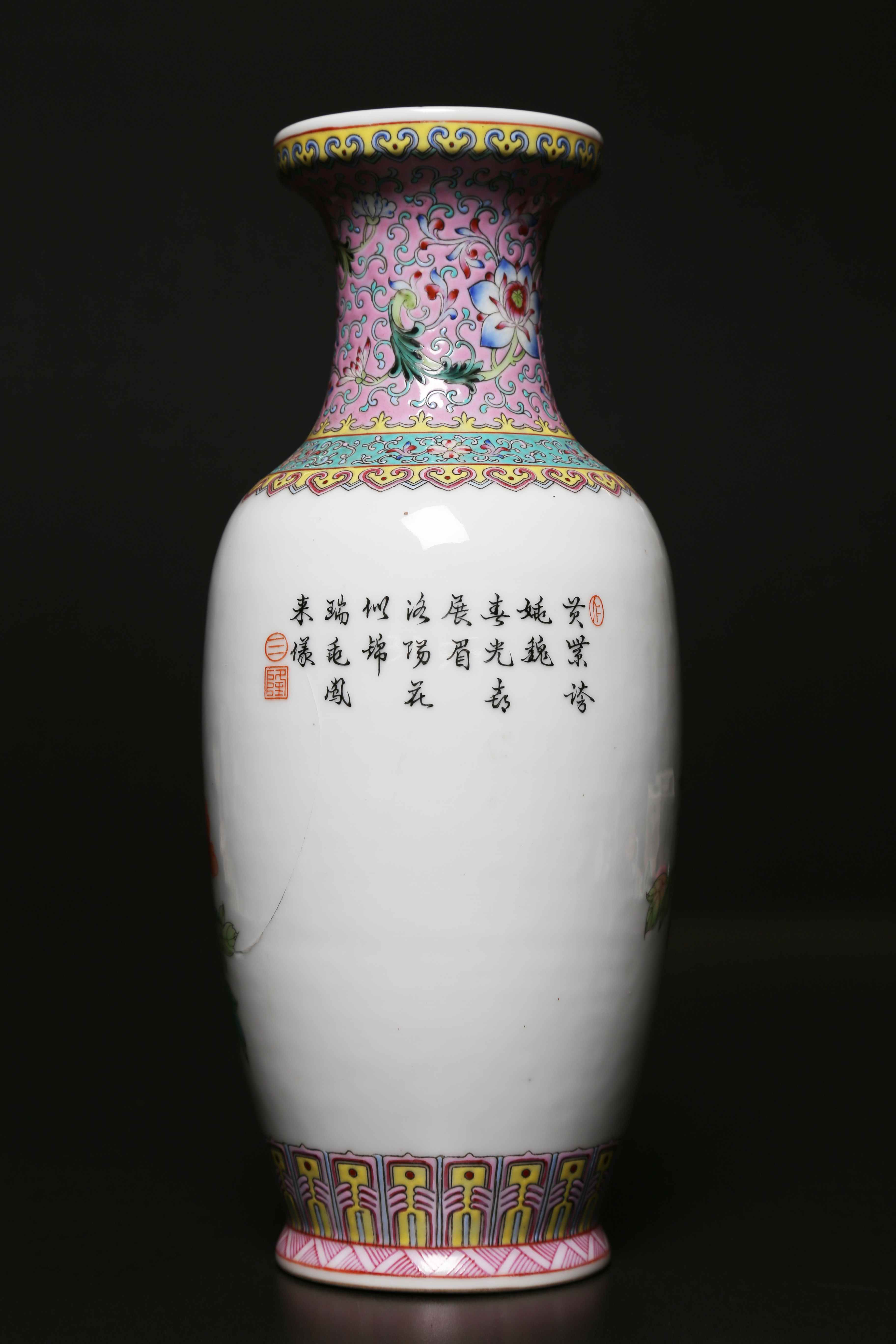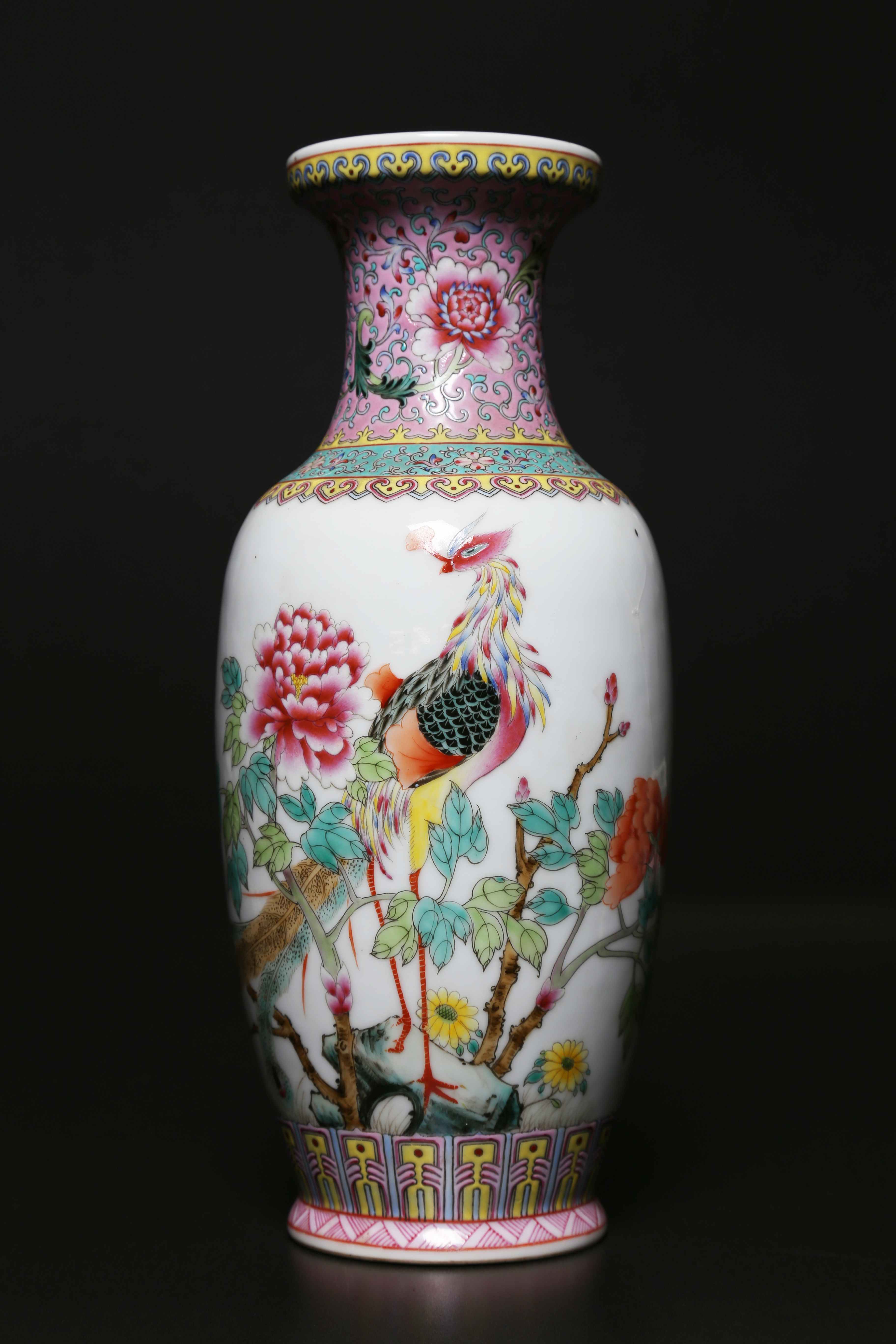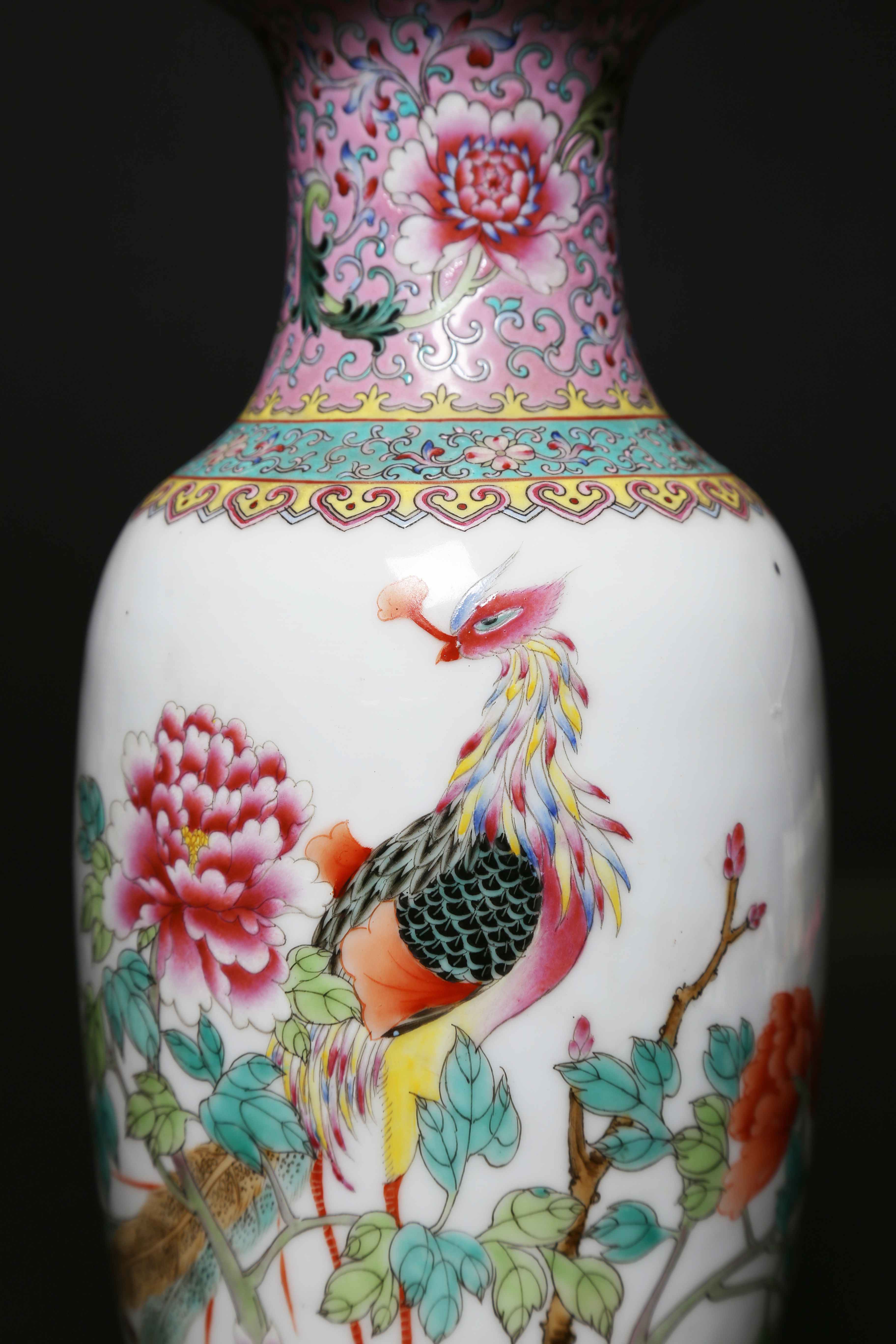 Arte Cinese Vaso da esportazione in porcellana stile famiglia rosa Cina, XIX secolo. -. Cm 30,00. Il corpo centrale smaltato con motivi vegetali, una grande peonia ed un'elegante fenice. Il retro reca lunga iscrizione poetica con sigillo e marchio dell'artista. Diametro bocca: 8,6 cm Filatura.